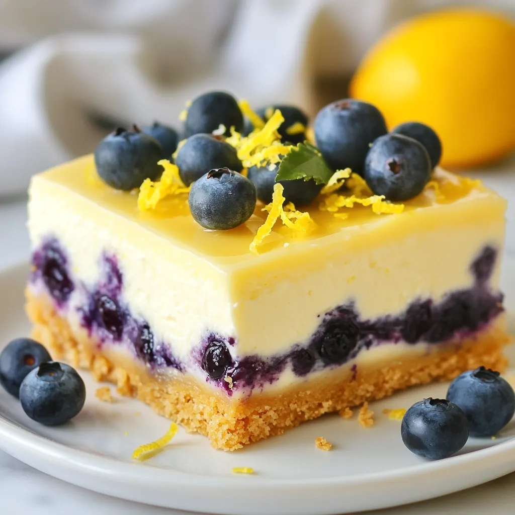 To make blueberry lemon cheesecake bars, you'll need these key ingredients: - 1 and 1/2 cups graham cracker crumbs - 1/4 cup granulated sugar - 1/2 cup unsalted butter, melted - 16 oz cream cheese, softened at room temperature - 1 cup granulated sugar - 2 large eggs, at room temperature - 1 teaspoon pure vanilla extract - Zest of 1 lemon - 1/4 cup freshly squeezed lemon juice - 1 cup fresh blueberries (plus extra for topping) When measuring ingredients, be precise. Use dry measuring cups for dry items like graham cracker crumbs and sugar. For liquids, use a liquid measuring cup. Here are a few tips: - Graham cracker crumbs: Crush them finely for a better crust. You can use a food processor or place them in a zip-top bag and crush with a rolling pin. - Cream cheese: Let it soften at room temperature for about an hour. This helps it mix smoothly. - Lemon juice: Always use fresh juice for the best taste. It brightens the flavor so well. Using good ingredients makes a big difference. High-quality cream cheese gives a rich and creamy texture. Fresh blueberries add natural sweetness and vibrant color. Here’s why quality matters: - Flavor: Fresh ingredients enhance the taste. You’ll notice the difference. - Texture: Quality products mix better. This leads to a smoother filling. - Presentation: Fresh fruit looks beautiful and makes your dessert appealing. By focusing on these details, you create blueberry lemon cheesecake bars that shine in taste and look. {{ingredient_image_2}} First, set your oven to 350°F (175°C). This heat helps cook the bars evenly. Grab an 8x8 inch baking pan. Line it with parchment paper, leaving some paper hanging over the sides. This makes it easy to lift the bars out later. In a medium bowl, mix 1 and 1/2 cups of graham cracker crumbs with 1/4 cup of granulated sugar. Pour in 1/2 cup of melted unsalted butter. Stir this mixture until it looks like wet sand. Press the crust firmly into the bottom of your prepared pan. Bake it for 10 minutes. Let it cool a bit while you make the filling. In a large bowl, beat 16 oz of softened cream cheese. Use an electric mixer on medium speed for about 2 minutes until it's smooth. Gradually add 1 cup of granulated sugar while mixing. Then, add 2 large eggs one at a time, mixing well after each. Next, fold in 1 teaspoon of pure vanilla extract, the zest of 1 lemon, and 1/4 cup of freshly squeezed lemon juice. Mix until everything is combined. Lastly, gently fold in 1 cup of fresh blueberries, being careful not to break them. Now, pour the cheesecake filling over your cooled crust. Smooth the top with a spatula. Bake in the oven for 30 to 35 minutes. The edges should be set, but the center can still jiggle a bit. After baking, let the bars cool at room temperature. Then, put them in the fridge for at least 4 hours, or better yet, overnight. This helps them set perfectly. When ready to serve, lift the cheesecake bars out of the pan using the parchment paper. Cut them into squares. For a nice touch, garnish with extra fresh blueberries and a sprinkle of lemon zest. This adds color and makes them look even more appetizing! When making blueberry lemon cheesecake bars, it’s easy to make mistakes. Here are a few to watch for: - Overmixing the filling: This can make the texture too dense. Mix just until combined. - Not using room temperature ingredients: Cold cream cheese can lead to lumps. Always let it warm up. - Skipping the chilling time: These bars need time to set. Don't rush the cooling process. For the best texture, focus on these steps: - Beat the cream cheese well: Make it smooth and fluffy for a creamy filling. - Fold in the blueberries gently: This keeps them whole and adds nice bursts of flavor. - Check the baking time: The center should jiggle slightly. This means it will set perfectly as it cools. You can boost the flavors in your cheesecake bars. Here’s how: - Use fresh lemon juice and zest: This adds brightness to the bars. - Add a pinch of salt: It balances the sweetness and enhances the berry flavor. - Top with extra blueberries: This fresh garnish adds color and taste. Experimenting with these tips will make your cheesecake bars even more delightful! Pro Tips Room Temperature Cream Cheese: Make sure your cream cheese is at room temperature before mixing. This will ensure a smooth and creamy texture without lumps. Fresh Blueberries: Use fresh blueberries for the best flavor and texture. If using frozen, make sure to thaw and drain them well to avoid excess moisture in the filling. Chill Overnight: For the best results, refrigerate the cheesecake bars overnight. This allows the flavors to meld and the texture to firm up perfectly. Cleaning Cuts: To make clean cuts, use a sharp knife and wipe it with a damp cloth between each cut. This keeps the edges of the bars looking neat and professional. {{image_4}} You can easily swap some ingredients if you have dietary needs. For a gluten-free option, use gluten-free graham crackers. They work well in the crust. If you want a lower-sugar version, try using a sugar substitute. Look for ones that measure like sugar for the best results. For a dairy-free choice, you can use cashew cream instead of cream cheese. It gives a nice texture and flavor. While blueberries are delicious, you can try other fruits too. Raspberries add a nice tartness. Strawberries bring a sweet touch. Blackberries can also work well. Just make sure any fruit you use is fresh and ripe. This way, you’ll get the best flavor in your bars. You can mix and match fruits for even more fun flavors. Adding more flavor is a great way to make these bars special. Try adding a pinch of cinnamon for warmth. A splash of almond extract can add a nutty taste. If you love chocolate, fold in some mini chocolate chips. This adds a decadent touch. Lemon zest gives a bright, fresh flavor. You can even experiment with herbs like mint for a unique twist. Each addition makes these cheesecake bars a fun treat! To keep your blueber