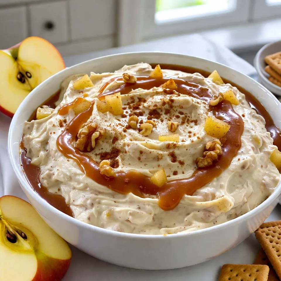 A deliciously creamy dip that combines the flavors of caramel and apple with a cheesecake twist, perfect for dipping with sliced apples and graham crackers.