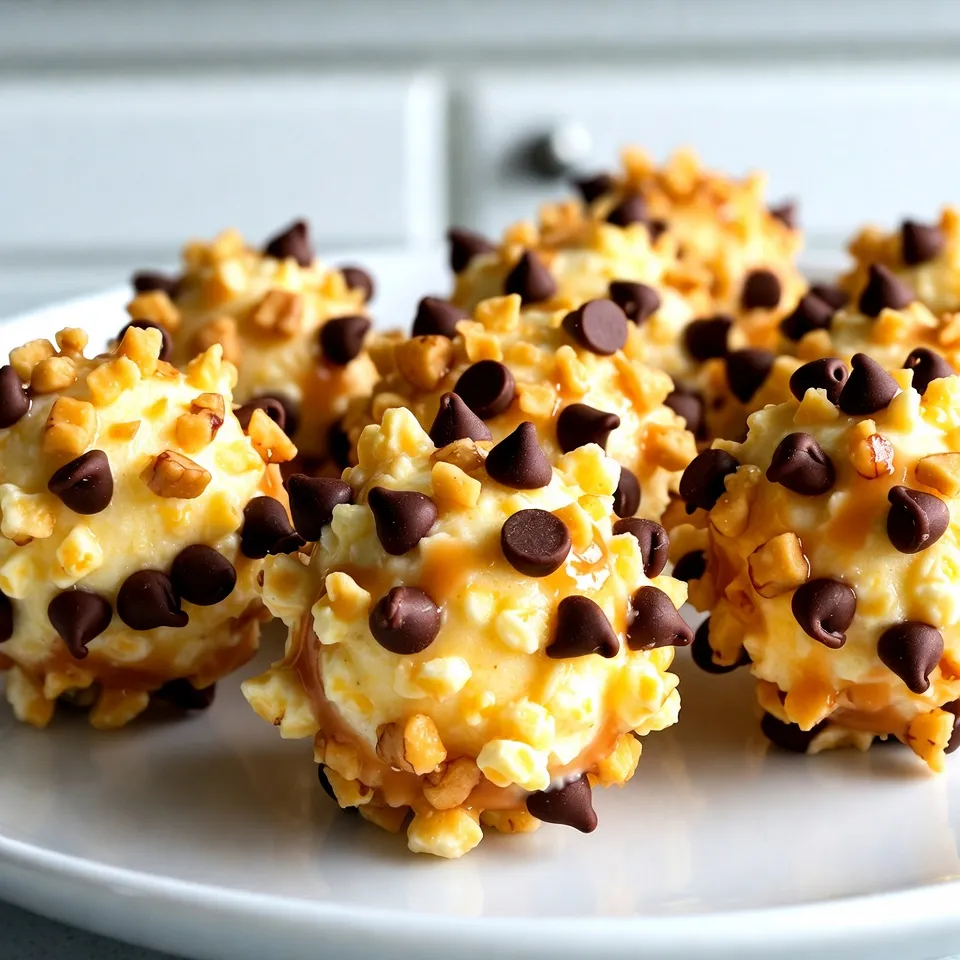 Delicious popcorn balls coated in caramel, chocolate, and nuts for a crunchy treat.