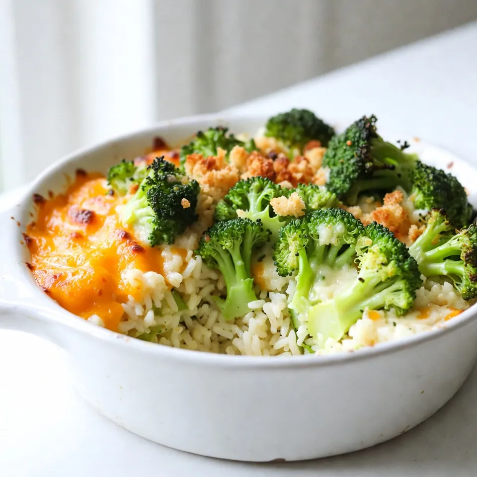 A comforting and cheesy casserole featuring broccoli and rice, perfect for a family meal.
