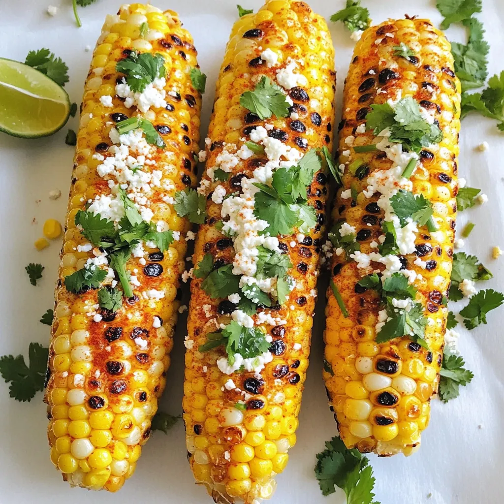- Fresh corn: 4 ears, husked and cleaned - Marinade components: - 3 tablespoons extra-virgin olive oil - 1 teaspoon smoked paprika - 1 teaspoon chili powder - 1/2 teaspoon garlic powder - 1/2 teaspoon sea salt - Juice of 2 limes (about 3 tablespoons) - Zest of 1 lime - Optional garnishes: - 1/4 cup crumbled cotija cheese - Fresh cilantro, finely chopped Fresh corn is vital for this recipe. Choose ears that feel firm and heavy. The husks should be bright green. Husk them well before you start. For the marinade, I mix olive oil, spices, and lime juice. The olive oil adds richness. Smoked paprika and chili powder add warmth. Garlic powder gives it a savory touch. Lime juice and zest bring brightness. Cotija cheese is optional but adds a creamy finish. Fresh cilantro brings color and a fresh taste. These garnishes make the dish shine. {{ingredient_image_2}} Start by preheating your grill to medium-high heat. Aim for a temperature of about 400°F (200°C). This heat helps achieve a nice char on the corn. Make sure the grates are clean for the best cooking results. In a medium bowl, mix these ingredients for your marinade: - 3 tablespoons extra-virgin olive oil - 1 teaspoon smoked paprika - 1 teaspoon chili powder - 1/2 teaspoon garlic powder - 1/2 teaspoon sea salt - Juice of 2 limes (about 3 tablespoons) - Zest of 1 lime Whisk them together well. This blend creates a zesty flavor that makes the corn pop. Take each ear of corn and brush the marinade all over it. Make sure every part of the corn is coated. This step ensures that the flavor seeps in while grilling. Carefully place the marinated corn on the grill grates. Grill it for about 10-15 minutes. Turn the corn every 2-3 minutes. This helps it cook evenly and gives it beautiful grill marks. The corn is ready when it feels tender and has some char. If you want to use cotija cheese, sprinkle it over the corn during the last few minutes of grilling. Close the grill lid briefly. This step lets the cheese soften without melting away completely. After grilling, take the corn off the grill and let it cool for a couple of minutes. Just before serving, drizzle fresh lime juice on top, add a pinch of chili powder, and sprinkle chopped cilantro for a fresh look. To get those beautiful grill marks on your corn, preheat your grill to medium-high heat, around 400°F. This hot surface helps create a nice char. Brush your corn with the marinade before placing it on the grill. Grill the corn for 10 to 15 minutes. Turn it every 2 to 3 minutes for even cooking. You'll know it's done when the kernels are tender and slightly charred. Want to kick up the flavor? Try adding a pinch of cayenne pepper for heat. You can also mix in some lime zest into the marinade for a brighter flavor. If you love herbs, fresh basil or oregano pairs well with the corn too. These little changes can elevate your dish and make it even more special. For a stunning display, arrange the grilled corn on a large platter. Garnish with lime wedges and fresh cilantro sprigs. You can also sprinkle extra cotija cheese on top for a creamy finish. This vibrant presentation makes it perfect for summer cookouts and gatherings. Your guests will be impressed! Pro Tips Choose Fresh Corn: Select ears of corn that are bright green with tightly wrapped husks. Fresh corn will have a sweet flavor and crisp texture, making your dish even more delicious. Marinate Longer: For an even bolder flavor, allow the corn to marinate in the olive oil and spice mixture for at least 30 minutes before grilling. This will enhance the taste and infuse the corn more thoroughly. Use High Heat: Grilling at medium-high heat ensures that the corn gets a nice char without becoming mushy. Keep an eye on it to prevent burning and achieve that perfect grill mark. Experiment with Toppings: While cotija cheese is a great addition, feel free to experiment with other toppings like feta, avocado, or even spicy mayo to customize your grilled corn to your liking. {{image_4}} You can switch up the cheese in this recipe to match your taste. Cotija cheese gives a creamy, salty punch. If you want something different, try feta or goat cheese. For a vegan option, use nutritional yeast or a vegan cheese that melts well. These changes can still keep the dish tasty and unique. Spice levels can change how you enjoy this dish. If you like heat, add more chili powder or a pinch of cayenne. For a milder flavor, reduce the chili powder. You can also mix in fresh herbs, like oregano or mint, for a fresh twist. This keeps your grilled corn exciting and full of flavor. Grilled corn pairs well with many dishes. Serve it alongside grilled meats, like chicken or steak, for a complete meal. You can also enjoy it with tacos or salads. For drinks, try pairing it with a cold beer or a zesty limeade. These combinations make your summer meals even better. To store your leftover grilled corn, first let it cool down. This step is key. Next, wrap the corn tightly in plastic wrap or place it in an airtight container. This helps keep moisture in and prevents drying out. You can store the corn in the fridge for up to three days. If you want to keep it longer, consider freezing it. Wrap each ear in aluminum foil and put them in a freezer bag. This way, you can enjoy that delicious flavor later on. Reheating grilled corn can be tricky. You want that fresh taste, not dried-out kernels. The best method is to use the grill again. Preheat your grill to medium heat. Place the corn back on the grill for about five minutes. Turn it often to warm it evenly. If you don't have a grill, you can use the microwave. Wrap the corn in a damp paper towel and microwave for one to two minutes. This method helps keep the corn moist and tasty. Enjoy your leftovers just as much as the first time! Grill the corn for 10 to 15 minutes. Turn it every 2 to 3 minutes. This helps it cook evenly and get those nice grill marks. You know the corn is ready when it feels tender and has a bit of char. Ye