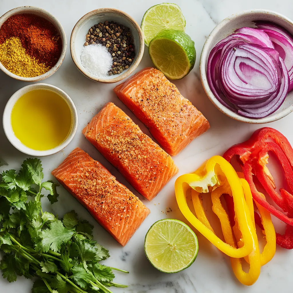 For this recipe, you need 4 salmon fillets. Each fillet should weigh about 6 ounces. Salmon is rich in omega-3s and adds a lovely flavor. The marinade gives the salmon its zesty flavor. Here are the ingredients you’ll need: - 2 tablespoons extra virgin olive oil - Zest and juice of 2 limes - 1 teaspoon ground chili powder - 1 teaspoon garlic powder - 1 teaspoon honey - 1/2 teaspoon sea salt - 1/2 teaspoon freshly ground black pepper This mix creates a perfect balance of spice and zest. The lime juice brightens the dish, while the honey adds a touch of sweetness. You will need colorful vegetables to accompany the salmon. Here are the choices: - 1 red bell pepper, sliced into strips - 1 yellow bell pepper, sliced into strips - 1 red onion, sliced into half-moons These vegetables roast nicely and complement the salmon. The bell peppers add crunch and sweetness, while the onion brings depth. {{ingredient_image_2}} First, we need to preheat the oven. Set it to 400°F (200°C). This step is key for even cooking. Use parchment paper or aluminum foil to line your baking sheet. It makes cleaning much easier later. Now, let’s make the zesty marinade. In a small bowl, mix these ingredients: - 2 tablespoons extra virgin olive oil - Zest and juice of 2 limes - 1 teaspoon ground chili powder - 1 teaspoon garlic powder - 1 teaspoon honey - 1/2 teaspoon sea salt - 1/2 teaspoon freshly ground black pepper Whisk these together until they blend well. This marinade is what gives our salmon its bold flavor. Next, it’s time to prepare the salmon and veggies. Place the four salmon fillets on one side of the baking sheet. Use a basting brush to coat both sides of the salmon with the marinade. Make sure every part gets some flavor. On the other side, arrange the sliced red and yellow bell peppers and red onion. Drizzle the leftover marinade over the veggies. Toss them with your hands or a spatula until they are nicely coated. Now we bake! Slide the baking sheet into the oven. Bake for about 12 to 15 minutes. The salmon should flake easily with a fork when done. The veggies should be tender and slightly caramelized. Keep an eye on them to avoid overcooking. Once everything is cooked, take the baking sheet out of the oven. Let it rest for a few minutes. This helps the flavors settle. Before serving, sprinkle fresh chopped cilantro over the salmon and veggies. This adds a nice pop of color and flavor. To make a great marinade, use fresh limes. The zest adds a nice touch. Mix the olive oil, lime juice, and spices well. This helps all the flavors blend. Brush the marinade on both sides of the salmon. This step ensures every bite is tasty. Let the salmon sit in the marinade for at least 10 minutes. This allows the flavors to soak in. If you have time, let it marinate longer for a stronger taste. Bake the salmon for 12 to 15 minutes. The salmon is done when it flakes easily. Use a fork to check for doneness. The vegetables should be tender and slightly caramelized. If you prefer crispy veggies, cook them for a few extra minutes. Keep an eye on the oven to avoid overcooking. Each oven is different, so check a minute or two early. For a beautiful display, use a large serving platter. Place the salmon next to the roasted vegetables. This makes the dish inviting and colorful. Add lime wedges around the platter for a fresh look. Finally, sprinkle chopped cilantro on top. This adds color and flavor. A well-presented dish makes every meal special. It also impresses your guests! Pro Tips Marinate for More Flavor: For an even bolder flavor, marinate the salmon for at least 30 minutes or up to 2 hours in the refrigerator before baking. This allows the spices to penetrate the fish more deeply. Use Fresh Ingredients: Whenever possible, opt for fresh lime juice and fresh cilantro. Fresh ingredients elevate the dish's flavor and aroma, making it more vibrant and enjoyable. Don’t Overcrowd the Pan: Ensure the salmon and vegetables have enough space on the baking sheet. Overcrowding can lead to steaming instead of roasting, which affects the texture and flavor. Check for Doneness: Use a fork to gently flake the salmon at the thickest part. If it flakes easily, it’s done. Avoid overcooking to keep the salmon tender and juicy. {{image_4}} You can mix up the veggies in this dish. Try using zucchini or asparagus. Both vegetables roast well and add great taste. You can also use broccoli or snap peas for a nice crunch. Just remember to cut them into even pieces. This helps them cook at the same time. The chili lime marinade is key, but you can switch it up. For a sweeter touch, add more honey. If you like heat, toss in some cayenne pepper. You could also use soy sauce for a savory twist. Another option is to use fresh herbs like basil or parsley. They bring bright flavors to the salmon. Serve your chili lime salmon with rice or quinoa for a filling meal. You can also add a fresh salad on the side. A simple mix of lettuce, tomatoes, and avocado pairs well. If you want more flavor, squeeze extra lime juice over everything. For a fun twist, serve it in tacos with crunchy slaw. To keep your chili lime salmon fresh, place it in an airtight container. Make sure to separate the salmon from the veggies if you want the best taste. Store it in the fridge for up to three days. This helps keep the flavors intact and makes for a quick meal later. When you're ready to enjoy leftovers, preheat your oven to 350°F (175°C). Place the salmon and veggies on a baking sheet. Cover with foil to keep them moist. Heat for about 10-15 minutes, or until warmed through. You can also use the microwave, but it may not keep the same crispness. Heat in short bursts to avoid overcooking. If you want to save it for later, freezing works well. Wrap each salmon fillet tightly in plastic wrap. Then, place the wrapped fillets in a freezer bag. You can freeze the veggies, too. They will stay fresh for up to three months. When you're ready to eat, thaw them in the fri