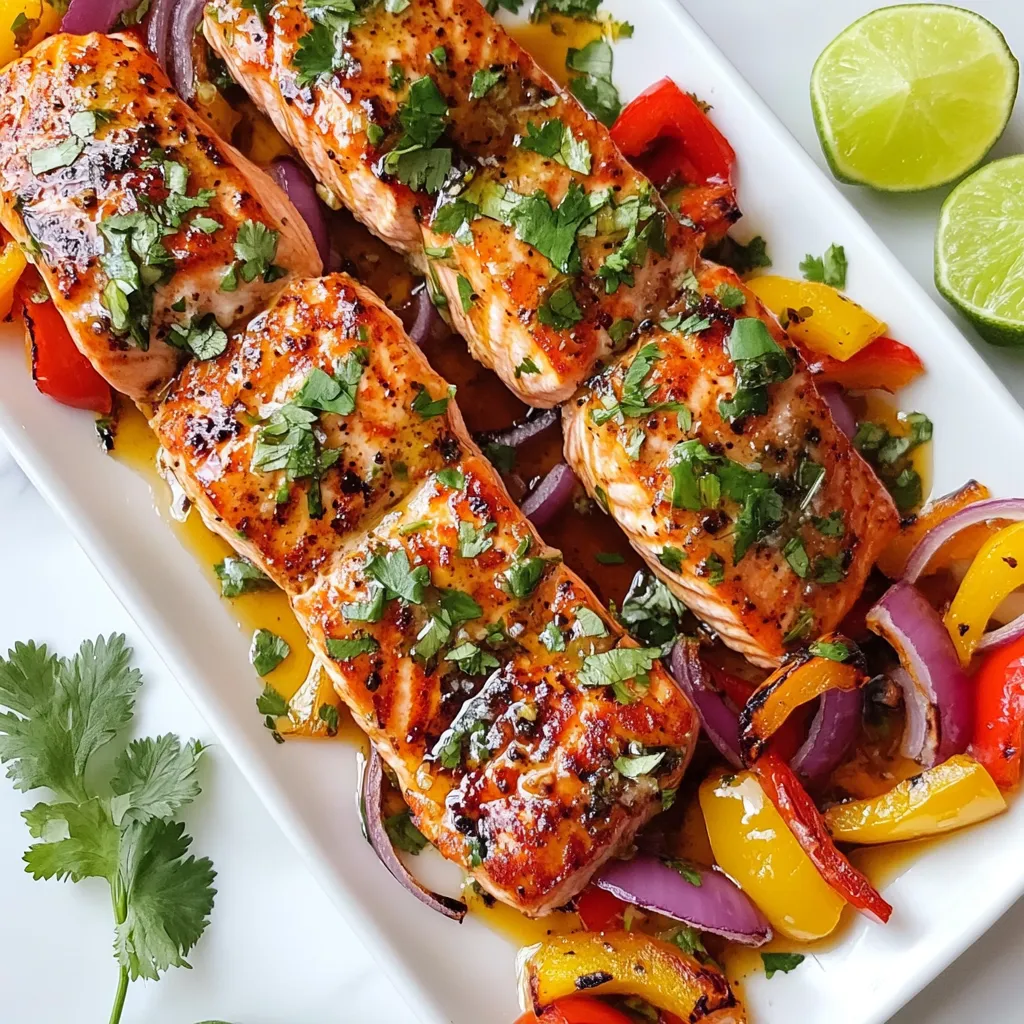 For an inviting presentation, arrange the salmon fillets alongside the roasted vegetables on a large serving platter. Include lime wedges on the side for an extra burst of zest. Finish by sprinkling additional chopped cilantro atop the dish for a vibrant and fresh touch!