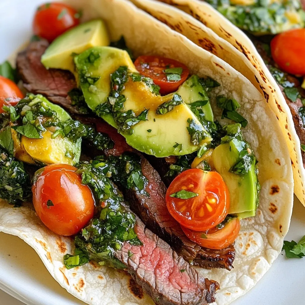 Delicious tacos filled with grilled flank steak and topped with a vibrant chimichurri sauce, avocado, and cherry tomatoes.