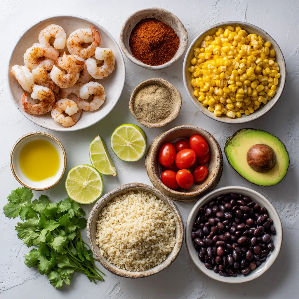 To assemble, place a scoop of quinoa at the bottom of each bowl, layer with cooked shrimp, corn, sliced avocado, halved cherry tomatoes, and black beans.