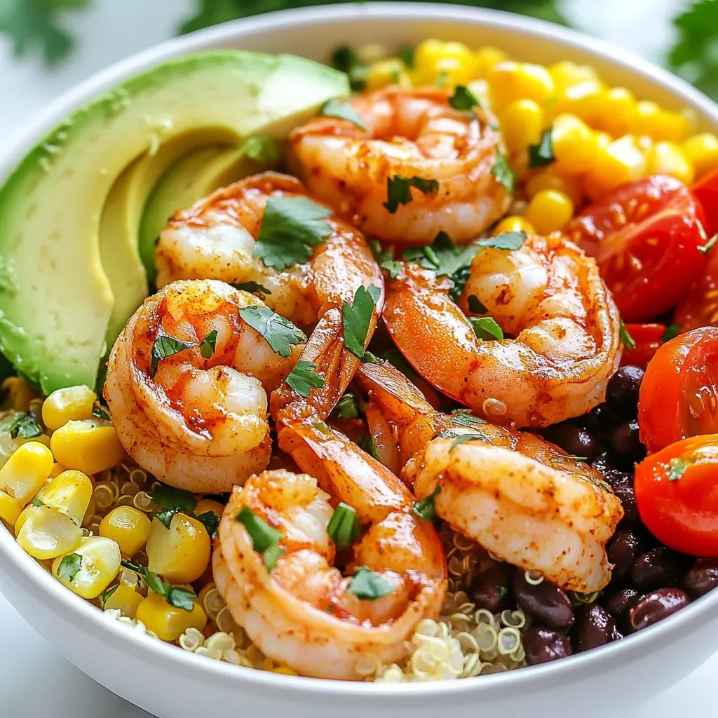 For the assembly, start with a generous scoop of fluffy quinoa at the bottom of each bowl. Layer the cooked shrimp on top. Then, add a colorful mix of corn, sliced avocado, halved cherry tomatoes, and black beans. This will make your bowls look vibrant and inviting.