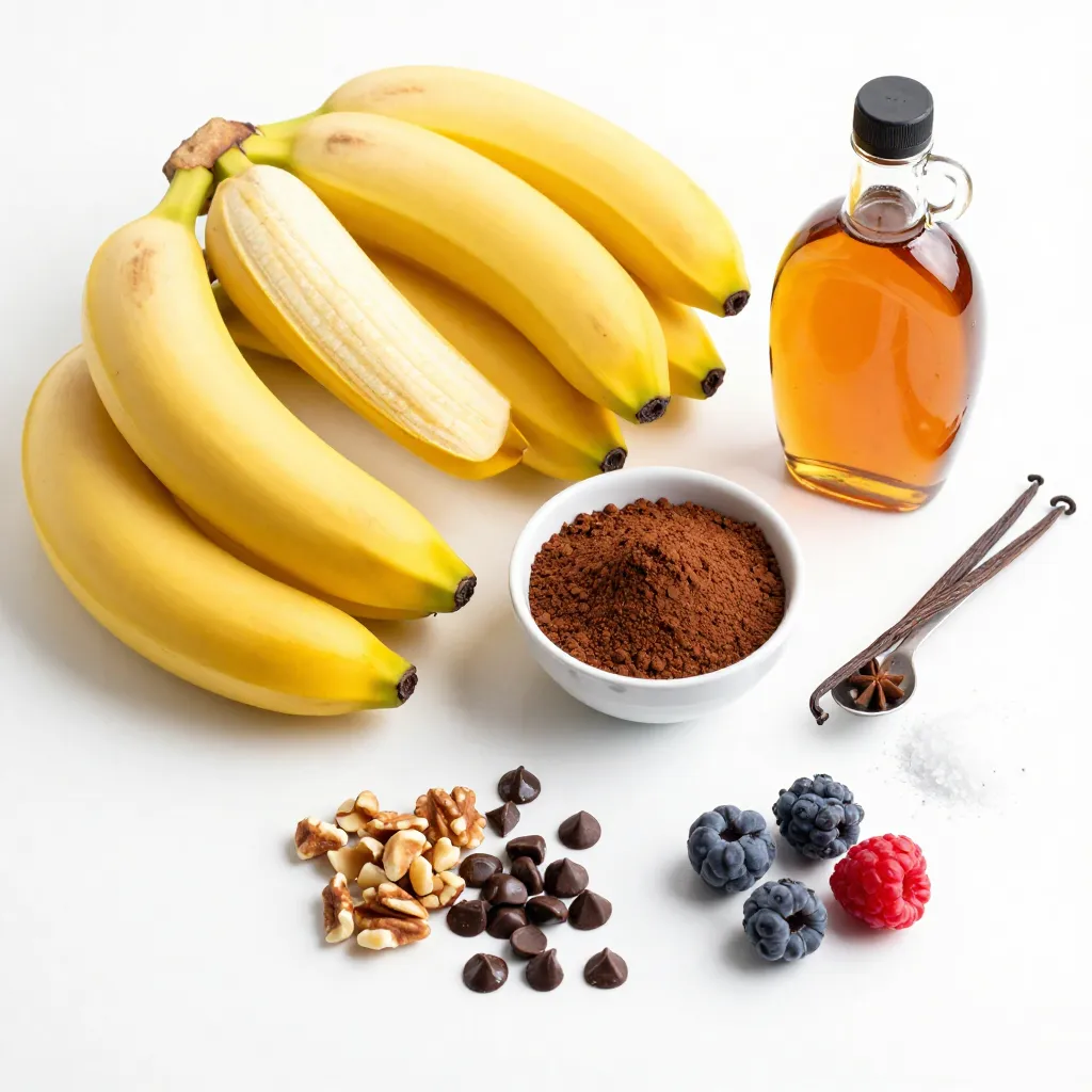 To make Chocolate Banana Nice Cream, you need a few simple ingredients. The ripe bananas are key for a sweet, creamy base. Choose bananas with lots of brown spots. They taste sweeter and blend better.