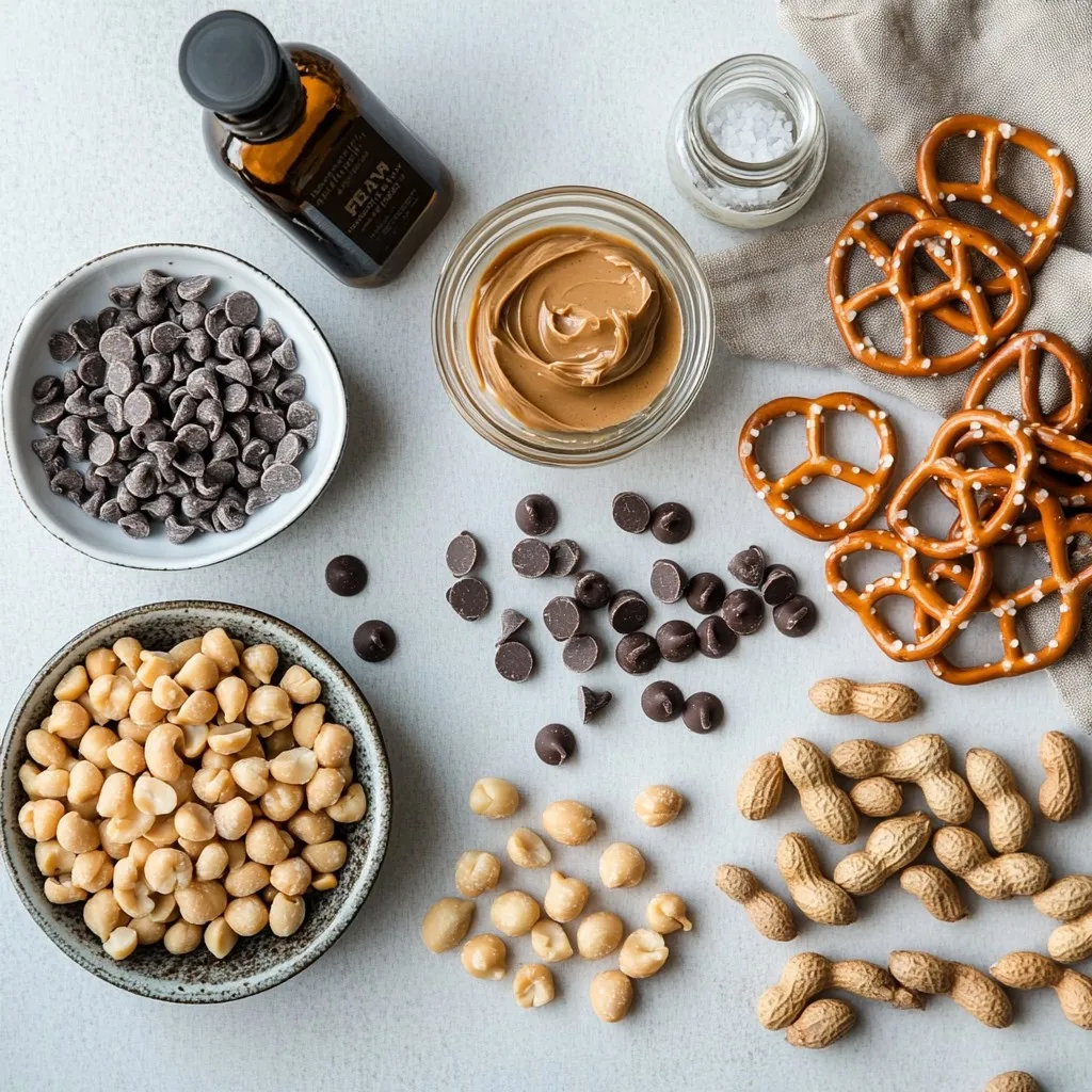 Gather these simple ingredients before you start. The mini pretzels bring the crunch, while the roasted peanuts add a nice bite. You can pick salted or unsalted peanuts based on your taste. The semi-sweet chocolate chips and creamy peanut butter blend well to create a smooth coating. If you want a touch of flavor, add sea salt on top. The vanilla extract enhances the taste too.