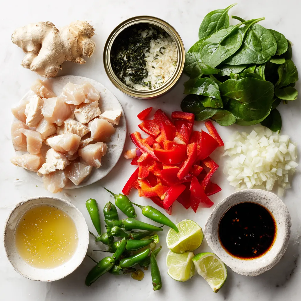 The heart of Coconut Lime Chicken Soup lies in its main ingredients. The chicken adds protein and texture. Coconut milk brings creaminess and a subtle sweetness. Fresh vegetables like onion, garlic, ginger, and bell pepper add flavor and nutrition. Green chilies give the soup a nice kick, while lime juice and zest brighten every bite.