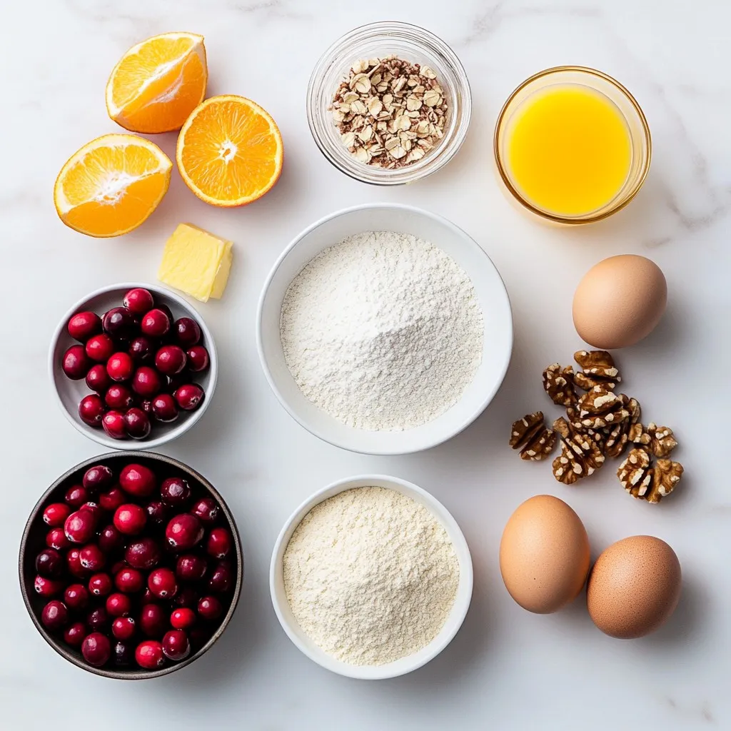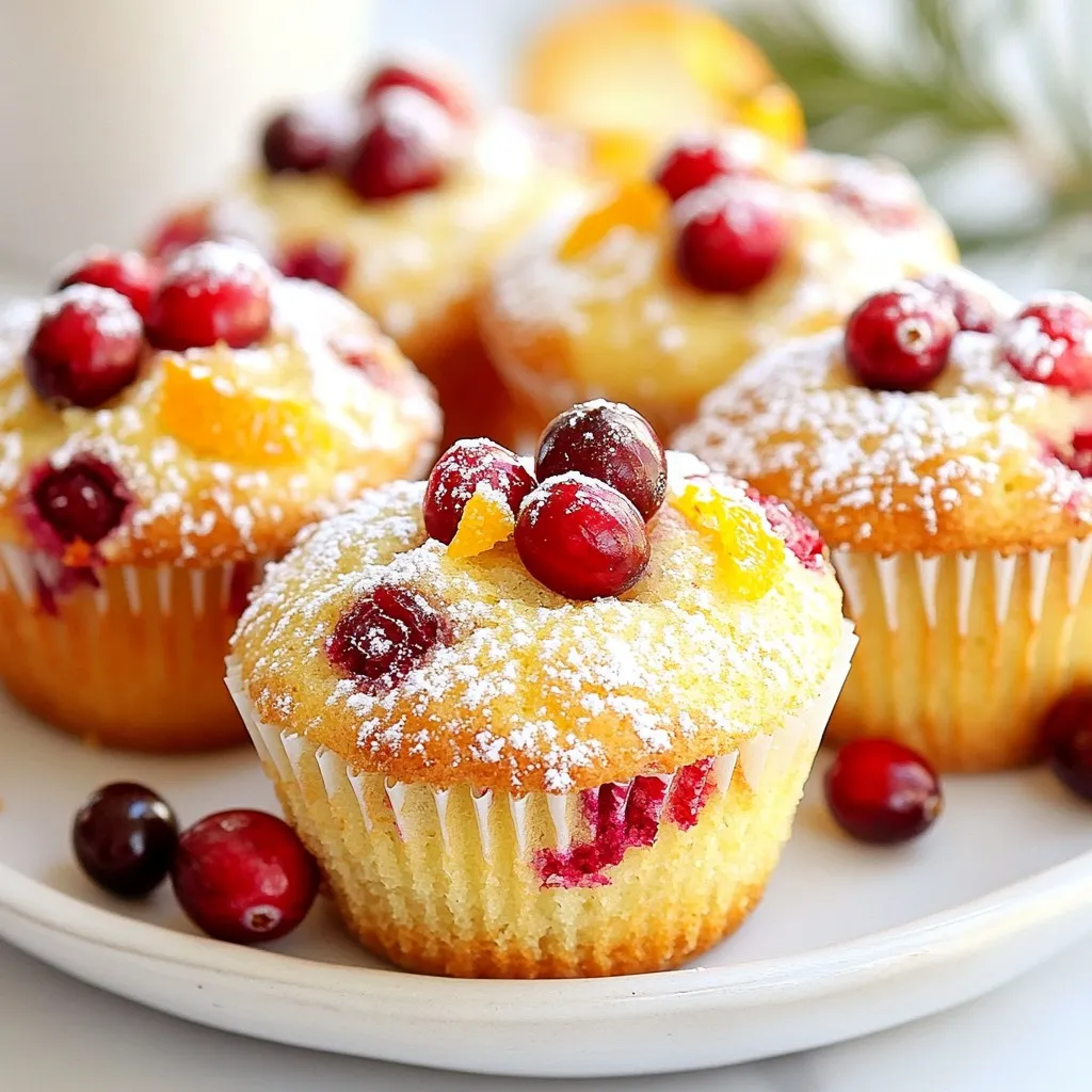 To make delicious cranberry orange muffins, you will need the following ingredients: - 2 cups all-purpose flour - 1 cup fresh cranberries, chopped - Zest of 1 juicy orange - 1/2 cup granulated sugar - 1/2 cup brown sugar packed - 1 tablespoon baking powder - 1/2 teaspoon baking soda - 1/4 teaspoon fine salt - 1/2 cup unsalted butter, melted and slightly cooled - 2 large eggs at room temperature - 1 cup freshly squeezed orange juice - 1 teaspoon pure vanilla extract - 1/2 teaspoon ground cinnamon - 1/2 cup walnuts, chopped (optional) These ingredients work together to create a muffin that is both sweet and tart. The fresh cranberries add a burst of flavor, while the orange zest brightens each bite. The mix of granulated and brown sugar gives the muffins a rich sweetness. Using melted butter helps keep the muffins moist. Adding eggs at room temperature ensures they blend well with the other wet ingredients. Freshly squeezed orange juice makes a big difference in taste. If you like nuts, feel free to add walnuts for extra crunch. Gather these ingredients before you start baking. This way, you will be ready to create a batch of muffins that everyone will love! {{ingredient_image_2}} - Preheat oven to 375°F (190°C). - Prepare muffin tin with liners or cooking spray. Start by preheating your oven. Set it to 375°F (190°C). This step is key to get your muffins baked just right. While the oven warms, grab your muffin tin. You can use paper liners or spray the cups with cooking spray. This keeps the muffins from sticking later. - Combine flour, sugars, baking powder, baking soda, salt, and cinnamon. Next, we’ll mix the dry ingredients. In a large bowl, add 2 cups of all-purpose flour. Then, add 1/2 cup of granulated sugar and 1/2 cup of brown sugar. Sprinkle in 1 tablespoon of baking powder, 1/2 teaspoon of baking soda, 1/4 teaspoon of fine salt, and 1/2 teaspoon of ground cinnamon. Whisk these together until they are well mixed. This helps the muffins rise and gives them flavor. - Whisk together melted butter, eggs, orange juice, vanilla, and zest. Now, let’s prepare the wet ingredients. In another bowl, take 1/2 cup of melted butter that has cooled a bit. Add 2 large eggs and 1 cup of freshly squeezed orange juice. Don’t forget the zest of 1 juicy orange and 1 teaspoon of pure vanilla extract. Whisk these ingredients together until smooth. This mix brings moisture and flavor to our muffins. - Gradually mix wet ingredients into dry until just combined. It's time to combine the mixtures. Pour the wet ingredients into the dry ones slowly. Use a spatula or a wooden spoon to mix. Stir gently until just combined. You want to stop when you still see a few lumps. This keeps the muffins light and fluffy. - Gently fold in chopped cranberries and walnuts. Now, add the fun part: cranberries! Fold in 1 cup of chopped fresh cranberries. If you like, you can also add 1/2 cup of chopped walnuts. Gently mix them in to ensure they’re spread evenly without overworking the batter. - Fill muffin cups and bake for 18 to 22 minutes, check for doneness. Scoop the batter into the prepared muffin cups. Fill each one about two-thirds full. This allows room for rising. Place the tin in the oven and bake for 18 to 22 minutes. To check if they are done, insert a toothpick into the center. It should come out clean or with a few moist crumbs. Once baked, let the muffins cool for about 5 minutes in the tin before moving them to a wire rack. To get the best texture in your cranberry orange muffins, avoid overmixing the batter. When you mix, do it gently. Let the batter have a few lumps. This helps keep your muffins soft and fluffy. When your muffins bake, watch them closely. Insert a toothpick into the center to check for doneness. If it comes out clean or with a few moist crumbs, they are ready. After baking, cool the muffins in the tin for about five minutes. This helps them set before you move them to a wire rack. Serving your muffins warm makes them even better. You can dust them with powdered sugar for a sweet touch. For an extra burst of flavor, try a light drizzle of orange glaze made from powdered sugar and orange juice. This adds a nice shine and flavor to your muffins. Pro Tips Use Fresh Ingredients: Always opt for fresh cranberries and a juicy orange to maximize flavor and ensure your muffins have the best taste and texture. Don't Overmix the Batter: To achieve light and fluffy muffins, mix the batter just until combined. A few lumps are perfectly fine! Check for Doneness: Use a toothpick to test the center of a muffin; it should come out clean or with a few moist crumbs, ensuring they are perfectly baked. Cool on a Wire Rack: After baking, transfer muffins to a wire rack to cool completely. This prevents them from becoming soggy and maintains their texture. {{image_4}} You can easily make these muffins gluten-free. Just swap all-purpose flour with a gluten-free flour blend. Look for one that works well in baking. This simple change keeps the taste and texture nice. Want to mix it up? You can add other fruits like blueberries or raspberries. They pair well with cranberries. If you want a lighter muffin, try using yogurt instead of butter. This gives a soft and moist texture. For a fun twist, add a teaspoon of almond extract. This small change brings a warm, nutty flavor to the muffins. It blends beautifully with the orange and cranberry tastes. You can also try other extracts like lemon or vanilla for more variety. Store your cranberry orange muffins in an airtight container. They stay fresh at room temperature for up to 3 days. Keep them away from heat and direct sunlight to maintain their softness. This way, you can enjoy them for breakfast or as a snack. For longer storage, freeze the muffins. They can last for up to 3 months in the freezer. Wrap each muffin in plastic wrap and place them in a freezer bag. This method keeps them fresh and tasty for later. When you want to enjoy a warm muffin, reheat it 