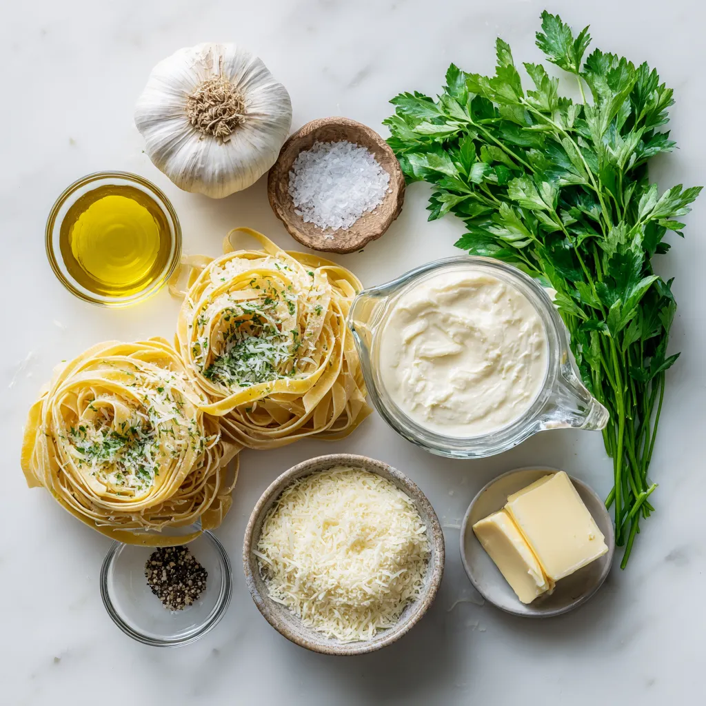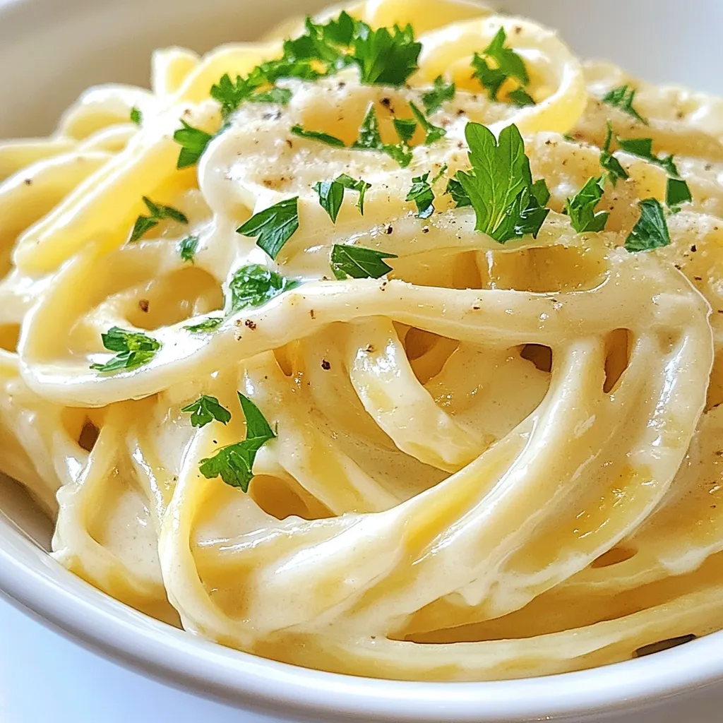 - 1 whole head of garlic - 12 ounces fettuccine pasta - 1 cup heavy cream - 2 tablespoons unsalted butter - Salt and freshly ground black pepper - Fresh parsley, finely chopped - 2 tablespoons olive oil - Grated Parmesan cheese When I make Creamy Roasted Garlic Alfredo, I love using fresh ingredients. The garlic brings a sweet and rich flavor. Roasting it adds depth that makes this dish shine. Fettuccine pasta is my go-to choice because it holds the sauce well. The heavy cream creates a smooth and rich base. I always use unsalted butter for a clean taste. Salt and black pepper enhance the flavors. Fresh parsley adds a pop of color and freshness. The olive oil is essential for roasting the garlic. Finally, grated Parmesan cheese ties everything together. It adds umami and creaminess. Each ingredient contributes to the dish's richness and flavor. Keep them fresh for the best results. Enjoy the process of cooking this delightful meal! {{ingredient_image_2}} First, preheat your oven to 400°F (200°C). This step is key for roasting garlic. Next, take a whole head of garlic. Carefully slice off the top to reveal the cloves. Drizzle 2 tablespoons of olive oil over the exposed cloves. Wrap the garlic in aluminum foil. This keeps it from burning while roasting. While the garlic roasts, fill a large pot with water. Add a generous pinch of salt and bring it to a boil. Once boiling, add 12 ounces of fettuccine pasta. Cook it until it is al dente, which means firm to the bite. Before draining, reserve 1 cup of the starchy pasta water. Then, drain the pasta in a colander. Roasting garlic is simple. Place the wrapped garlic in the preheated oven. Roast it for about 30 to 35 minutes. The cloves should feel soft and caramelized. When done, take it out and let it cool for a few minutes. Cooling makes it easier to squeeze the roasted garlic from its skin. In a large skillet, melt 2 tablespoons of unsalted butter over medium heat. Once melted, squeeze the roasted garlic cloves into the skillet. Discard the skins. Use a fork to mash the garlic into a paste. This paste adds great flavor to the sauce. Gradually pour in 1 cup of heavy cream. Stir well to mix it with the garlic. Bring this mixture to a gentle simmer. Then, slowly whisk in 1 cup of grated Parmesan cheese. Stir until it melts and the sauce is smooth. If the sauce is too thick, add some reserved pasta water. Do this a little at a time until you reach the right creamy consistency. Now it's time to combine everything. Add the cooked fettuccine to the skillet with the sauce. Toss the pasta gently but thoroughly. Make sure each strand is coated in that rich, creamy sauce. Taste your sauce and add salt and freshly ground black pepper as needed. For a finishing touch, sprinkle finely chopped fresh parsley on top. This adds color and a hint of freshness. Serve your Creamy Roasted Garlic Alfredo right away for the best taste. You can use homemade stock to deepen the taste. Stock adds a rich layer that store-bought broth may lack. Try vegetable or chicken stock for a unique twist. For cheese, consider alternatives like Pecorino Romano or Asiago. These cheeses provide different flavors that can make your dish stand out. You can mix and match cheeses for even more fun. To adjust the thickness of your sauce, use the reserved pasta water. This starchy water helps thin the sauce without losing flavor. Add a little at a time until you reach your desired creaminess. Avoid lumps in your cheese sauce by whisking constantly as you add the cheese. This keeps the sauce smooth and silky. If lumps form, keep whisking vigorously until they disappear. When plating, twirl the fettuccine into nests. This creates a beautiful presentation. Top with a sprinkle of fresh parsley for color and freshness. For wine pairings, a crisp white like Sauvignon Blanc works well. It balances the rich flavors of the sauce. You can also serve it with a side salad or garlic bread for a complete meal. Pro Tips Use Fresh Garlic: Fresh garlic will provide a more robust flavor compared to pre-minced varieties. Roasting it enhances its sweetness and mellows the sharpness. Adjust the Creaminess: If the sauce is too thick, gradually add the reserved pasta water until you reach your desired consistency, ensuring a silky texture. Mix Cheese Types: For a more complex flavor, consider mixing Parmesan with other cheeses like Pecorino Romano or Asiago. Garnish with Citrus: A squeeze of lemon juice or a sprinkle of lemon zest before serving can brighten the flavors and add a refreshing contrast to the rich sauce. {{image_4}} You can easily change the pasta for this dish. If you prefer gluten-free options, try rice or chickpea pasta. Both work well in this recipe. You can also add vegetables for extra flavor and nutrition. Spinach and mushrooms are great choices. They pair nicely with the creamy sauce and roasted garlic. To make your Alfredo unique, think about adding herbs or spices. Fresh basil or thyme can add a fresh twist. You can also include proteins like chicken or shrimp. These additions make the dish heartier and more satisfying. Just cook the protein separately and mix it in with the pasta. You can create a white wine Alfredo by adding a splash of white wine while making the sauce. This addition gives a nice depth of flavor. If you want to try alternatives, consider using a mix of ricotta cheese and cream. This option can lighten the dish while keeping it creamy and delicious. To store leftover Alfredo, let it cool to room temperature first. Then, place it in an airtight container. This helps keep it fresh. I recommend using glass containers or plastic ones that seal tightly. These containers prevent air exposure and keep the sauce creamy. To reheat without losing creaminess, use the stove. Heat over low heat, stirring often. This gentle method warms the sauce evenly. If it seems too thick, add a splash of milk or reserved pasta water. This helps restore its smooth texture. You can freeze Alfredo 