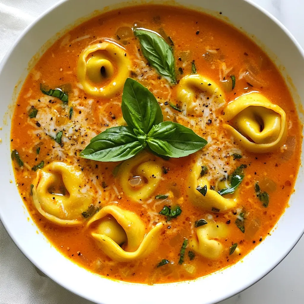 A rich and comforting soup made with cheese tortellini, crushed tomatoes, and heavy cream, garnished with fresh basil.