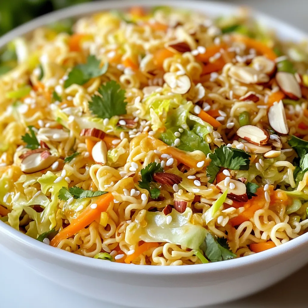 A refreshing and crunchy salad featuring ramen noodles and a variety of colorful vegetables, perfect for a light meal or side dish.