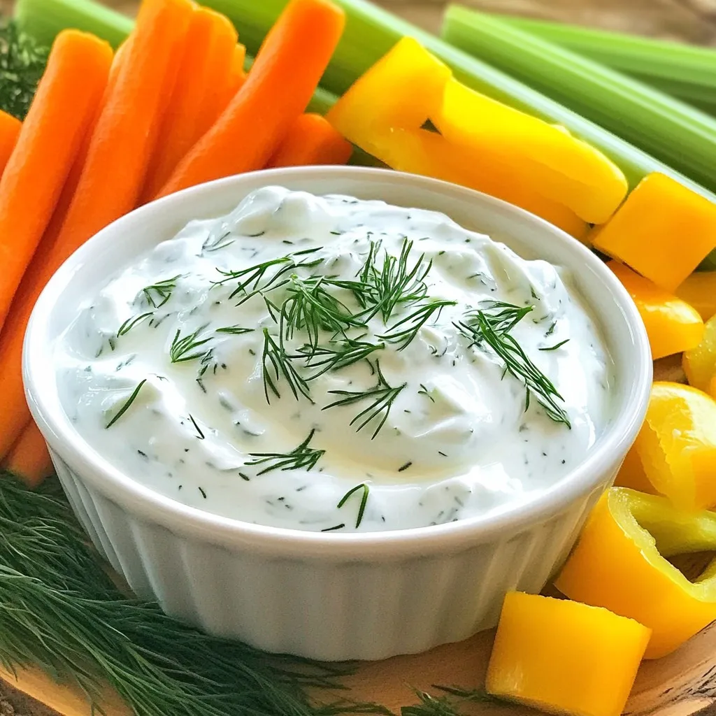 To make Cucumber Dill Greek Yogurt Dip, you will need: - 1 cup plain Greek yogurt - 1 medium cucumber, grated and excess moisture squeezed out - 2 tablespoons fresh dill, finely chopped - 1 tablespoon freshly squeezed lemon juice - 1 small garlic clove, finely minced - 1 teaspoon extra virgin olive oil - Salt and freshly cracked black pepper to taste These ingredients create a tasty dip that is both creamy and refreshing. The Greek yogurt gives it richness, while the cucumber adds crunch. The dill brings a fresh flavor that brightens up the dish. You can customize your dip with optional add-ins. Here are a few ideas: - Chopped green onions: Adds a mild onion flavor. - Crumbled feta cheese: Gives a salty, tangy taste. - Red pepper flakes: For a bit of heat. - Chopped olives: Adds a briny depth. These add-ins can help you create a dip that suits your taste. Feel free to mix and match to find your favorite. If you want a dairy-free dip, you can swap out the Greek yogurt. Here are some great options: - Silken tofu: Blend it until smooth for a creamy texture. - Coconut yogurt: Offers a slight sweetness and a creamy base. - Cashew cream: Soak cashews and blend them for a rich, nutty flavor. These substitutions keep the dip creamy while making it friendly for those avoiding dairy. You can enjoy this dip without missing out on flavor! {{ingredient_image_2}} Start by grating the cucumber. Use a box grater or a food processor. Grating makes it easier to mix. After you grate, place the cucumber on a clean kitchen towel. Gather the corners of the towel and twist it. Squeeze hard to get out extra liquid. This step keeps your dip from being too watery. In a large bowl, add the drained cucumber. Next, mix in the plain Greek yogurt. Then, add the finely chopped fresh dill. Stir these three ingredients gently. Make sure they blend well together. Now, pour in the freshly squeezed lemon juice and minced garlic. Also, add the extra virgin olive oil. Now it's time to add some flavor. Season your mix with salt and freshly cracked black pepper. Taste it to find the right balance for you. Stir all the ingredients well until they are creamy. Cover the bowl tightly with plastic wrap or a lid. Chill the dip in the refrigerator for at least 30 minutes. This waiting time helps the flavors blend nicely. To make your dip smooth, squeeze the cucumber well. Use a clean kitchen towel or cheesecloth. This step removes extra water. A watery dip will not taste right. Aim for a thick, creamy texture. This makes each bite satisfying and rich. To boost flavors, try adding a pinch of cayenne. This gives a nice kick. You can also mix in some fresh mint for a twist. If you want a zesty touch, add more lemon juice. Taste as you go, and adjust to your liking. A little salt and pepper go a long way, too. Make your dip look fancy by using a shallow bowl. Add a sprig of dill on top for color. Surround it with bright veggie sticks like carrots and bell peppers. You can also use pita chips for a fun crunch. This not only looks good but also invites everyone to dig in. Pro Tips Choose the Right Cucumber: Opt for English cucumbers for a milder flavor and fewer seeds, making your dip smoother and more enjoyable. Chill for Best Flavor: Allow the dip to chill for at least an hour to let the flavors meld together, enhancing the overall taste. Experiment with Herbs: Feel free to mix in other fresh herbs like parsley or mint for a unique twist on the classic flavor profile. Perfect Your Seasoning: Always taste and adjust the salt and pepper before serving, as the flavors can develop further while chilling. {{image_4}} You can make this dip even more fun by adding different flavors. Try mixing in some chopped olives or sun-dried tomatoes. You could also add a bit of feta cheese for a salty kick. If you like sweetness, mix in some finely diced red bell pepper. Each of these add-ins can change the taste, making it unique. While dill is a star in this dip, you can switch things up with other herbs. Fresh mint adds a cool taste that works well with cucumber. Chives bring a mild onion flavor, making it tasty. You could also try parsley for a fresh twist. Mix and match herbs to find your perfect blend. If you love spice, consider adding red pepper flakes or finely chopped jalapeños. This will give your dip a nice kick. Start with a small amount, taste, and add more if you want it spicier. This variation is great for those who enjoy a bit of heat with their refreshing dip. To keep your Cucumber Dill Greek Yogurt Dip fresh, store it in an airtight container. Make sure the lid seals tightly. This helps prevent any unwanted odors from your fridge from getting in. Always place the dip in the main part of the fridge, not in the door. The door can be warmer, which can spoil your dip faster. When stored properly, this dip can last up to five days in the fridge. However, for the best taste and texture, aim to eat it within three days. Always check for any changes in color or smell before consuming leftovers. If you notice anything off, it's best to throw it out. Freezing is not recommended for this dip. Greek yogurt can change in texture once frozen and thawed. It may become grainy or watery. If you want to make it ahead, simply prepare a fresh batch when you need it. This way, you get the best flavor and texture every time! You can serve this dip with many snacks. Fresh veggie sticks are great. Try carrots, celery, or bell peppers. Pita chips work well too. They add a nice crunch. You can also use crackers for a salty bite. For a fun twist, serve it with grilled meats. This dip adds a cool touch. This dip can last up to four days in the fridge. Make sure to store it in a sealed container. The flavors will blend nicely over time. If you notice any off smell or change in color, it's best to toss it. Always check before enjoying! Yes, you can use less garlic or skip it. Garlic adds flavor, but it’s not a must. If you want a milder taste, reduce the amount. Yo