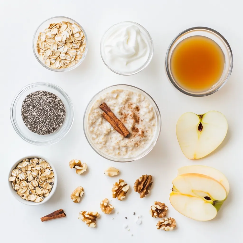To make Apple Pie Overnight Oats, you need simple, easy items. Rolled oats serve as the base, bringing fiber and texture. Almond milk keeps it creamy and adds flavor. The diced apple gives a fresh taste and sweetness. Cinnamon and nutmeg bring warmth, making it feel like pie. Maple syrup adds a touch of sweetness. Chia seeds help thicken the oats and add nutrients. Greek yogurt makes it rich and creamy. Walnuts give a nice crunch on top. Finally, don’t forget the apple slices for a pretty finish!