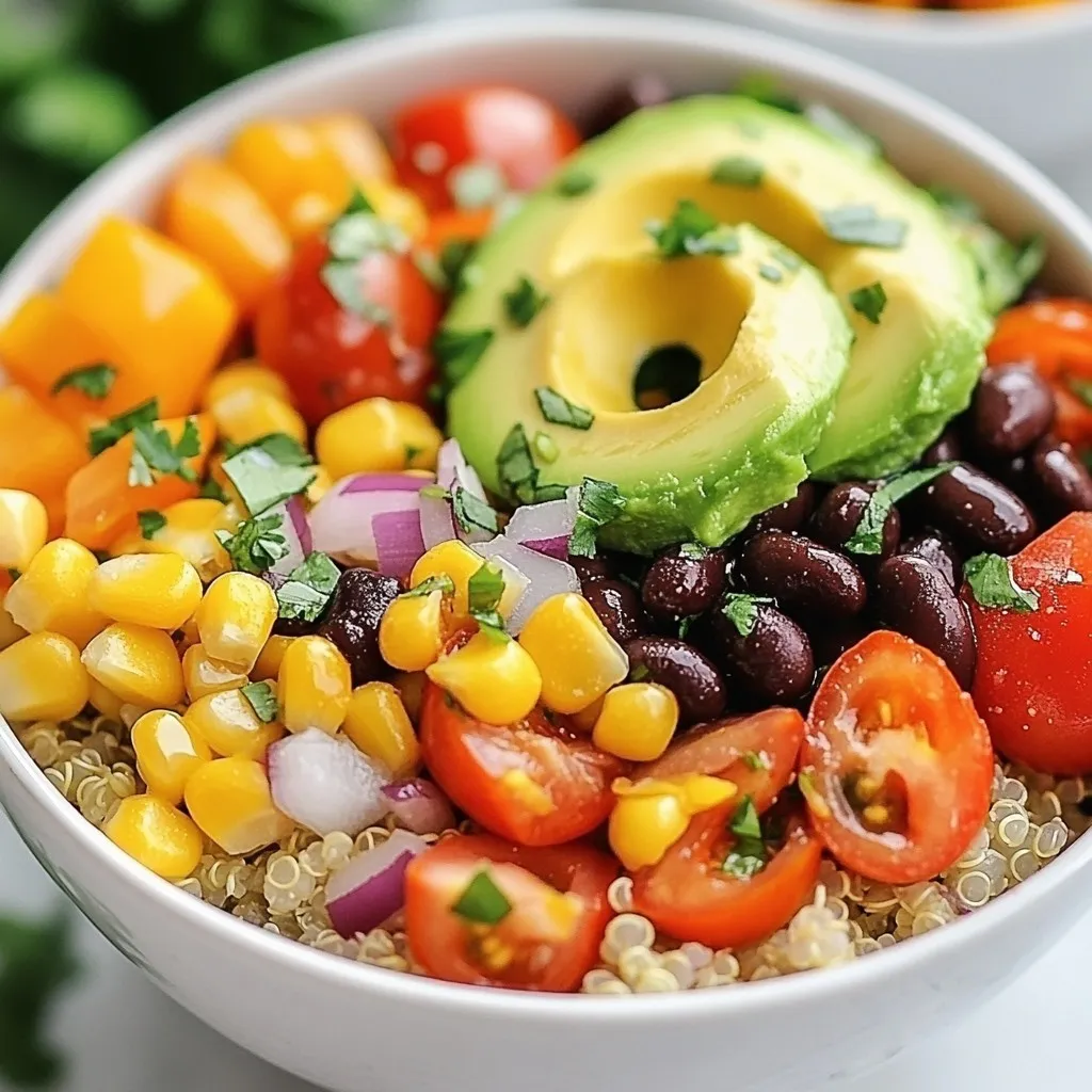 A colorful and healthful meal bursting with flavor, featuring quinoa, black beans, and fresh vegetables.