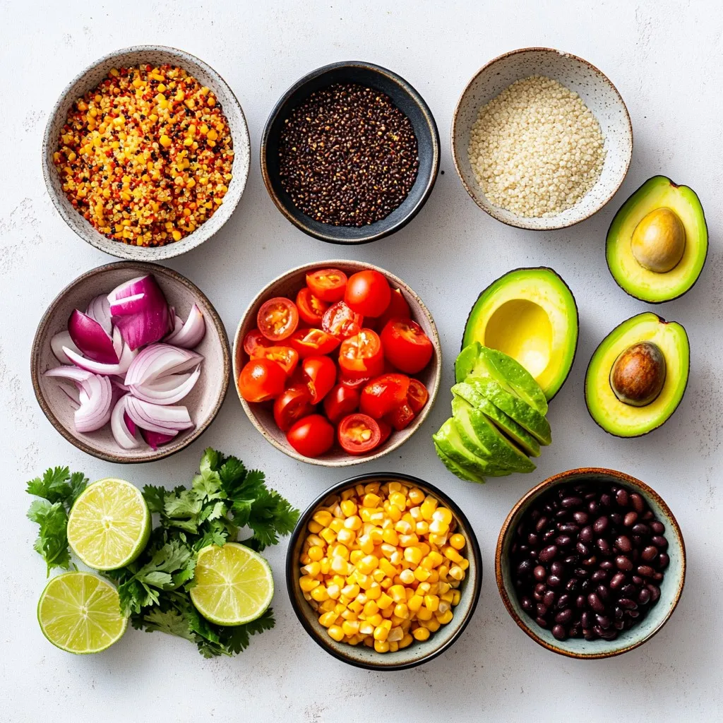Quinoa is a super grain. It has protein and all nine essential amino acids. Black beans add fiber and protein, making the dish filling. Corn gives a sweet burst of flavor and adds vitamins. Avocado is rich in healthy fats, which are good for your heart. Tomatoes are low in calories and high in vitamins. Together, these ingredients create a balanced meal.