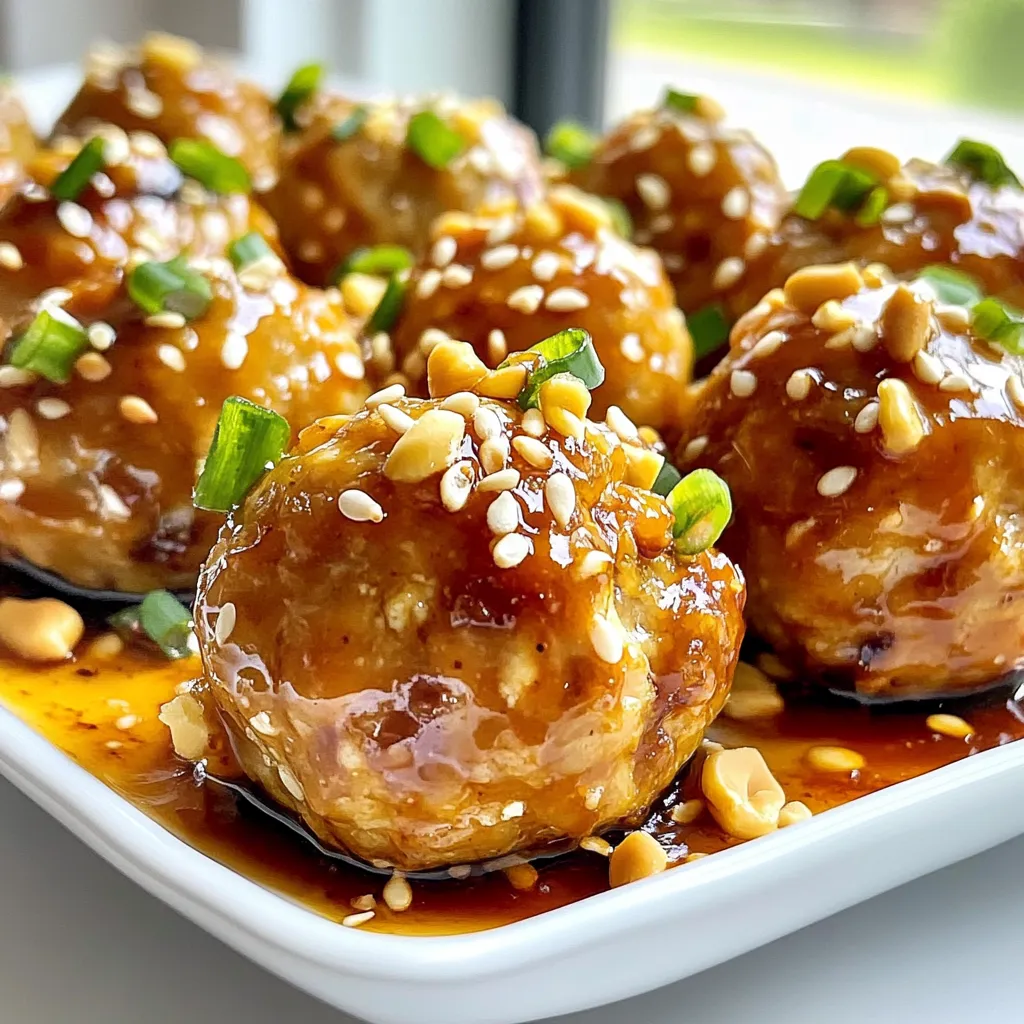 Serve the warm meatballs on a large platter, generously garnished with chopped peanuts, sesame seeds, and additional green onions for a refreshing pop of color.