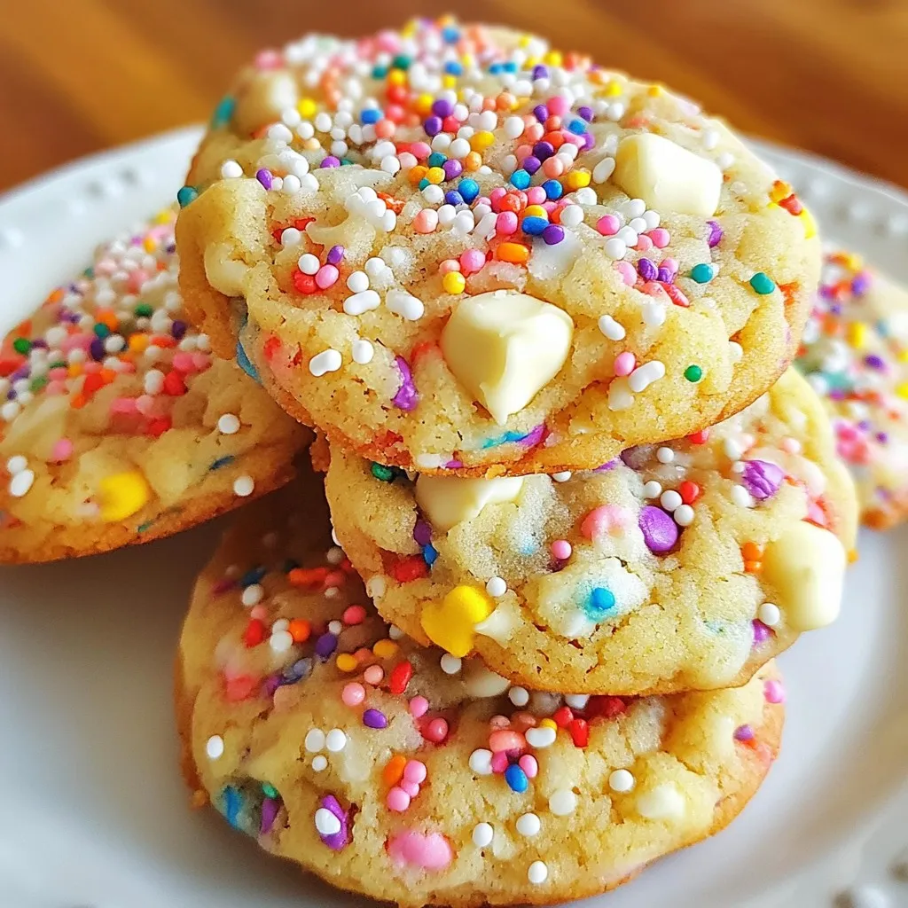 Cheerful cookies filled with rainbow sprinkles and white chocolate chips, perfect for celebrations.