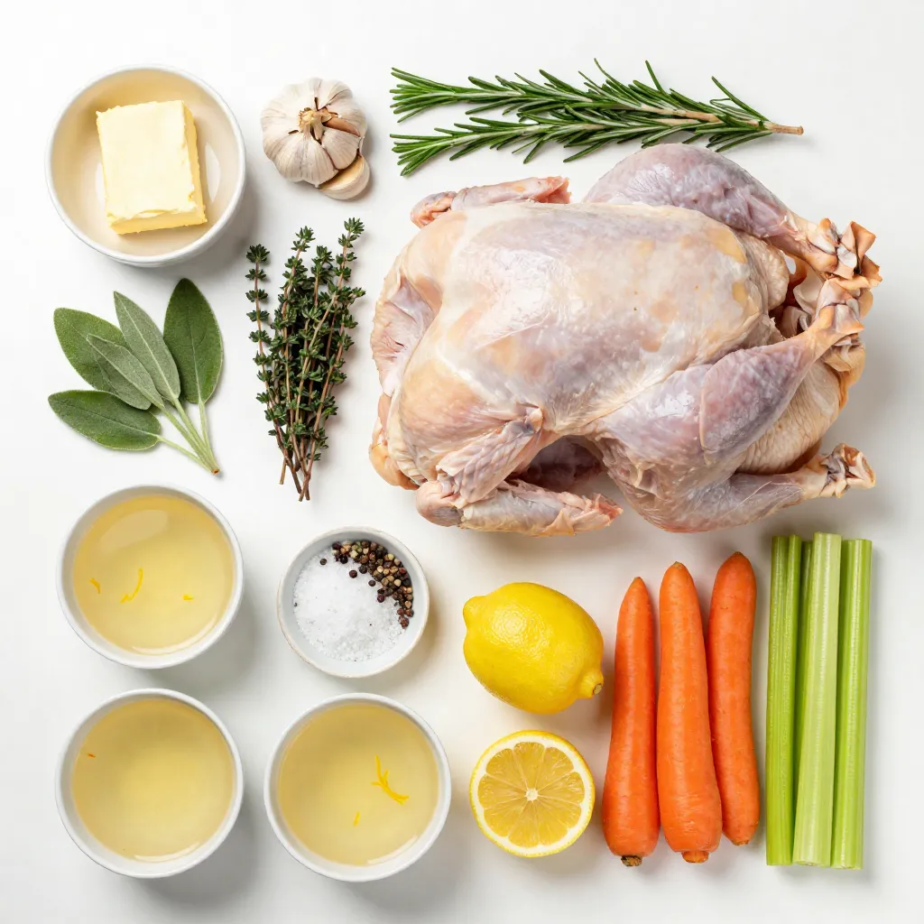 For the turkey, choose a size between 12 and 14 pounds. A whole turkey is best for roasting. The unsalted butter adds richness. Fresh herbs like rosemary, thyme, and sage bring great flavor.