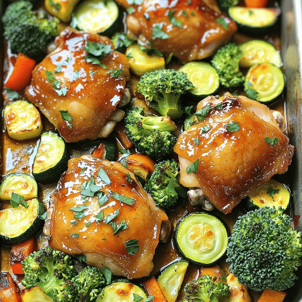 - 1 lb boneless, skinless chicken thighs - 2 tablespoons honey - 3 cloves garlic, finely minced - 2 tablespoons soy sauce - 1 tablespoon extra-virgin olive oil - 1 medium zucchini, sliced into half-moons - 1 bell pepper, cut into bite-sized pieces - 1 cup fresh broccoli florets To make the Honey Garlic Chicken Veggie Sheet Pan, start with boneless, skinless chicken thighs. They stay juicy and tender during cooking. Honey gives a sweet touch, while garlic adds depth. Soy sauce brings umami, and olive oil keeps everything moist. For veggies, I love using zucchini, bell pepper, and broccoli. They not only taste great but also add color. - 1 teaspoon dried thyme - 1 teaspoon smoked paprika - Salt and black pepper to taste - Fresh parsley, finely chopped, for garnish For seasonings, I use dried thyme and smoked paprika. Thyme has a lovely, earthy flavor. Smoked paprika adds a slight smokiness. Use salt and black pepper to taste. Fresh parsley brightens up the dish. It adds a pop of color and freshness. This mix of flavors makes each bite special. 1. Preheat your oven to 400°F (200°C). This ensures even cooking. 2. Line a large baking sheet with parchment paper. This helps with easy cleanup. 3. In a bowl, mix together 2 tablespoons honey, 3 minced garlic cloves, 2 tablespoons soy sauce, 1 tablespoon olive oil, 1 teaspoon dried thyme, 1 teaspoon smoked paprika, salt, and black pepper. Whisk until smooth. 4. Add 1 pound of chicken thighs to the bowl. Coat each piece well. For the best flavor, let the chicken marinate for 15 minutes. If you have more time, marinate for up to 2 hours in the fridge. 1. While the chicken marinates, prepare your veggies. Start with slicing 1 medium zucchini into half-moons. 2. Cut 1 bell pepper into bite-sized pieces. 3. Wash and break 1 cup of broccoli into florets. 4. Arrange the zucchini, bell pepper, and broccoli on the baking sheet. 5. Drizzle a little olive oil over the veggies. Season with salt and pepper. Toss them well to coat evenly. 1. After marinating, place the chicken thighs on the baking sheet. Arrange them among the veggies. 2. Drizzle leftover marinade over both the chicken and veggies for more flavor. 3. Bake everything in the preheated oven for 25-30 minutes. 4. Check the chicken; it should reach an internal temperature of 165°F (75°C). The veggies should be tender and bright. 5. Once done, take the sheet pan out of the oven. Let it rest for about 5 minutes. 6. Before serving, sprinkle freshly chopped parsley on top for a fresh touch. For the best flavor, marinate chicken for at least 15 minutes. If you have more time, marinate overnight in the fridge. This step makes a big difference. The longer the chicken soaks, the better it tastes. To make sure chicken cooks evenly, cut thighs into similar sizes. This helps them cook at the same rate. For veggies, check their texture. They should be tender but still bright and crisp when done. For a fun presentation, serve the dish straight from the pan. It looks great and saves on cleanup. You can also plate individual servings. Add a sprinkle of sesame seeds or extra parsley for color. Pair this meal with rice or a light salad for a complete dining experience. {{image_4}} You can switch chicken thighs for many other proteins. Tofu works well for a plant-based option. Firm tofu holds its shape and absorbs flavors nicely. You can also use fish, like salmon or tilapia. They cook quickly and add a different taste. For veggies, choose what’s in season. You can use asparagus in spring or sweet potatoes in fall. Carrots and snap peas are great choices year-round. Mix and match to find your favorite combinations. If you need a gluten-free meal, use tamari instead of soy sauce. This keeps all the flavor without gluten. You can also skip the soy sauce entirely and add more honey for sweetness. For a low-carb or keto-friendly dish, swap out the honey for a low-carb sweetener like erythritol. Replace the zucchini with cauliflower for a veggie that’s lower in carbs. This keeps the meal tasty and fits your diet. To keep your Honey Garlic Chicken Veggie Sheet Pan fresh, follow these steps: - Allow the dish to cool completely after cooking. - Transfer leftovers into airtight containers. - Store in the fridge for up to 3 days. - For longer storage, freeze in a freezer-safe container for up to 3 months. Using glass containers helps retain heat and flavor. They also make it easy to see what’s inside. To enjoy this dish again, follow these reheating methods: - For best results, reheat in the oven at 350°F (175°C) for 15-20 minutes. - You can also use a microwave. Heat in 30-second intervals until warm. - Add a splash of water in the microwave to keep veggies from drying out. These methods help maintain the chicken's flavor and the veggies' crispness. Enjoy your meal just like when it was fresh! Yes, you can make this recipe ahead of time. Marinate the chicken in the fridge for up to 2 hours. You can also chop the veggies and store them in the fridge. When you're ready, just bake everything together. Yes, you can freeze this dish. Assemble the chicken and veggies, then place them in a freezer bag. Remove as much air as possible before sealing. You can freeze it for up to 3 months. Thaw it overnight in the fridge before baking. To adjust the recipe, simply halve the ingredients. Use ½ lb of chicken and reduce the veggies accordingly. Keep the marinade ratios the same for the best flavor. You can always save some for later! This dish pairs well with rice or quinoa. You could also serve it with a fresh salad or crusty bread. For a light touch, add a side of fruit. Enjoy exploring different combinations! You now have a clear guide to making a tasty Honey Garlic Chicken Veggie Sheet Pan meal. We covered choosing fresh ingredients, marinating chicken, and preparing colorful veggies. Cooking tips help ensure everything tastes great. Don’t be afraid to swap proteins and veggies to fit your taste. Proper storage keeps left