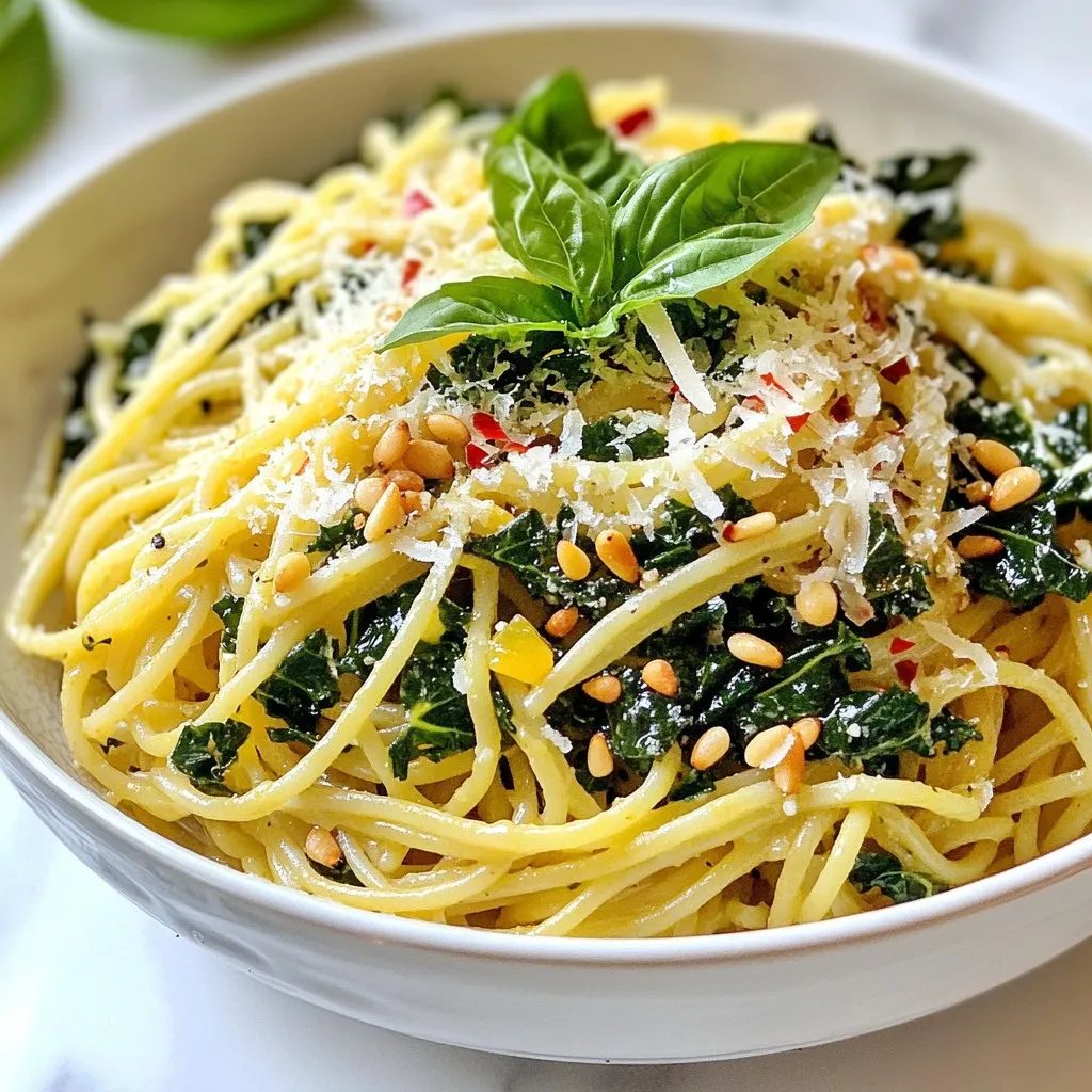 A vibrant and flavorful pasta dish featuring sautéed kale, garlic, and a zesty lemon finish.