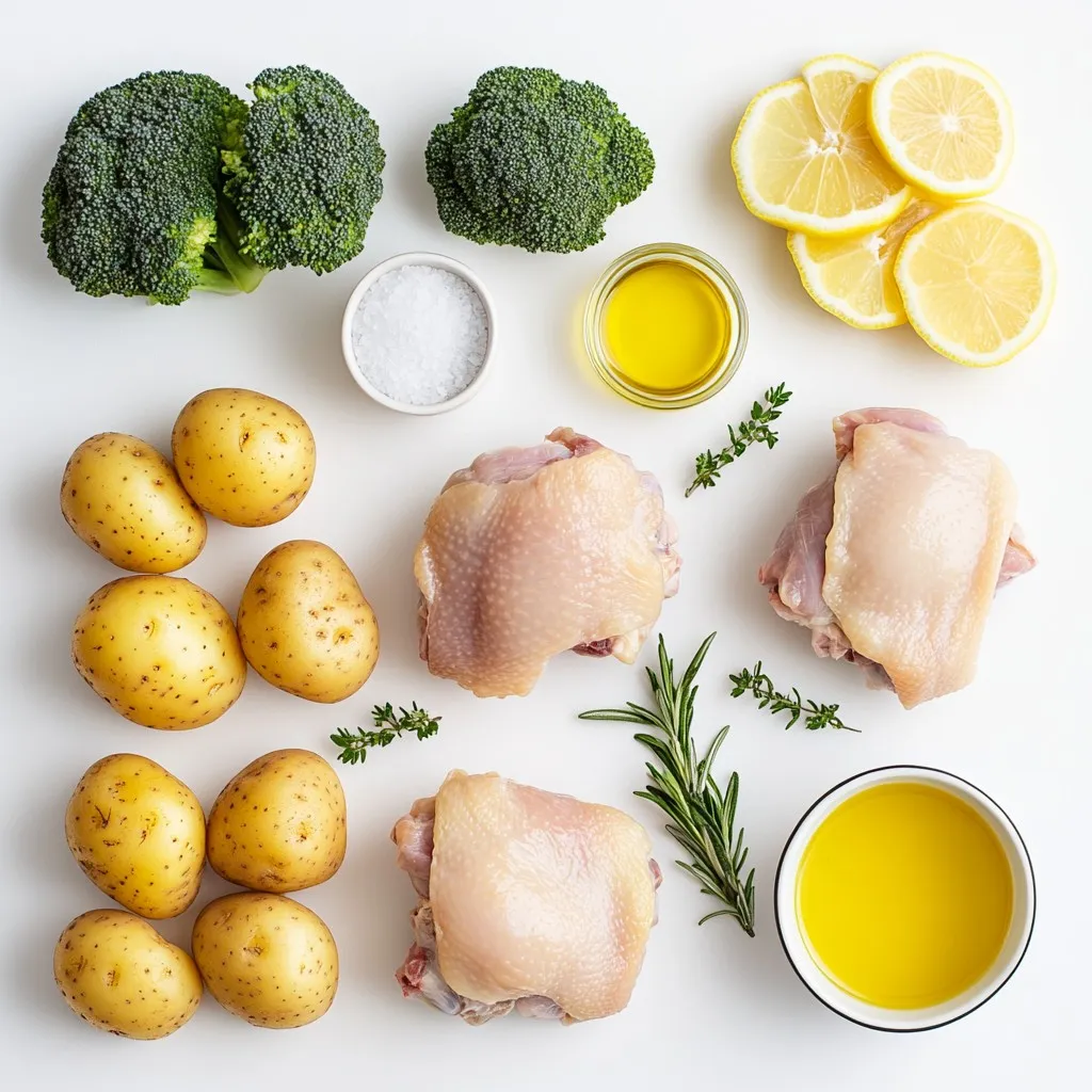 A flavorful and easy sheet pan dinner featuring marinated chicken thighs, baby potatoes, and broccoli, all roasted to perfection.