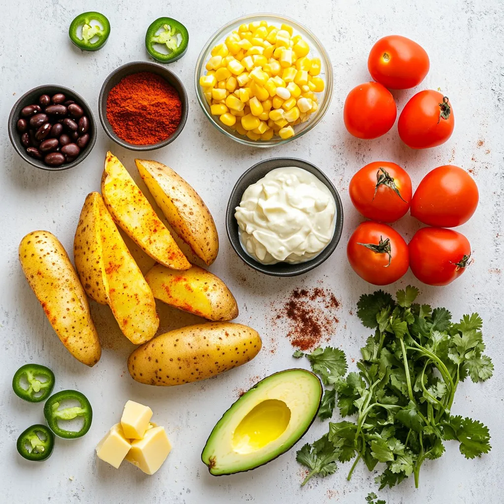 – Toppings: canned black beans, corn kernels, cherry tomatoes, shredded cheese, avocado, sour cream, cilantro, jalapeño