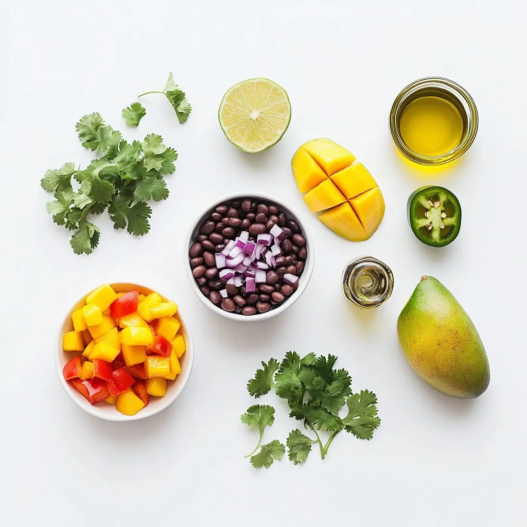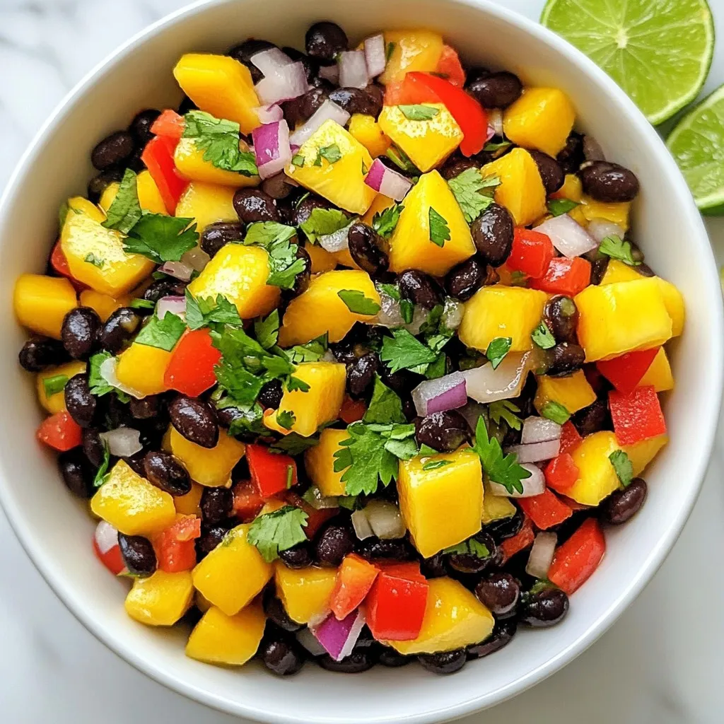 - 1 ripe mango, diced into small cubes - 1 can (15 oz) black beans, thoroughly rinsed and drained - 1 medium red bell pepper, diced finely - 1 small red onion, finely minced - 1 fresh jalapeño, seeds removed and diced small - 1/4 cup fresh cilantro leaves, chopped coarsely - Juice from 2 medium limes - 2 tablespoons extra virgin olive oil - Sea salt and freshly cracked black pepper, to taste Mango black bean salsa shines with vibrant flavors. The ripe mango brings sweetness and a tropical vibe. Black beans add protein and heartiness, making this salsa filling. The red bell pepper gives crunch and color, while the red onion adds a sharp bite. Jalapeño peppers bring a touch of heat, but you can adjust this to your taste. Fresh cilantro adds a bright, herbal note that pairs well with lime juice. Lime juice adds tang, balancing the sweet and savory notes. Extra virgin olive oil adds richness, while sea salt and black pepper enhance all the flavors. These ingredients work together, creating a fresh and delicious salsa perfect for any occasion. Enjoy this salsa on tortilla chips or as a topping for grilled meats. {{ingredient_image_2}} 1. In a large bowl, combine the diced mango, black beans, red bell pepper, red onion, and jalapeño. Stir carefully so you don’t mash the mango. 2. Next, add the chopped cilantro. This adds a fresh taste to the salsa. 3. In another bowl, whisk together the lime juice, olive oil, sea salt, and black pepper. This is your zesty dressing. 4. Drizzle the dressing over the other ingredients. Toss gently with a spatula to coat everything well. 5. Taste the salsa and adjust the seasoning. You can add more lime juice, salt, or pepper if needed. Letting the salsa rest is key. This time lets the flavors mix better. I recommend letting it sit for at least 15 minutes. This short wait will make your salsa even more tasty! - Avoid mashing mango: When you mix your ingredients, be gentle. You want those nice, fresh mango cubes to stay intact. Mashing will ruin the texture and look of the salsa. - Taste and adjust seasoning: Always taste your salsa before serving. You may want more lime juice or salt. Each ingredient shines, so adjust to your liking for the best flavor. - Decorative serving ideas: Serve your salsa in a bright bowl. A colorful dish makes your salsa pop. It also invites people to try it! - Garnishes for visual appeal: Add extra cilantro leaves and lime wedges around the bowl. This adds color and makes your salsa look even more delicious. Pair it with crispy tortilla chips for an irresistible treat! Pro Tips Choose Ripe Mangoes: Make sure your mango is ripe for the best flavor. A ripe mango will have a slight give when you press it gently and will emit a sweet aroma near the stem. Customize the Heat: Adjust the amount of jalapeño based on your heat preference. For a milder salsa, you can omit the seeds and membranes or use less jalapeño. Let it Rest: Allow the salsa to sit for at least 15 minutes before serving. This resting period helps the flavors meld together, resulting in a more harmonious taste. Serve with a Twist: For added flavor, try serving the salsa with lime-flavored tortilla chips or alongside grilled fish or chicken for a delicious pairing. {{image_4}} You can switch up the fruits in your salsa for fun flavors. Try using pineapple or peaches instead of mango. These fruits add sweetness and a different twist. You can also use avocado for creaminess. For legumes, black beans are great, but you can use chickpeas or kidney beans. Each legume brings a unique taste and texture. This way, you can create your own special salsa. Adding spices can elevate your salsa. Consider cumin for a warm, earthy flavor. A pinch of chili powder can add heat if you like spice. Mixing in fresh herbs enhances the taste too. Try adding mint or basil for a refreshing twist. These herbs can brighten the salsa and make it even more delicious. To keep your mango black bean salsa fresh, store it in the fridge. Place the salsa in an airtight container. This will help keep the flavors intact. Make sure to seal it well. If you have extra salsa, you can also use glass jars. They work great for storage. Mango black bean salsa lasts about 3 to 5 days in the fridge. After that, it may start to lose its taste and texture. Signs of spoilage include a change in color, strange smells, or an off taste. If you notice any of these signs, it’s best to toss the salsa. Enjoying your salsa fresh will always taste best! Yes, you can make this salsa ahead of time. It tastes even better after sitting for a while. The flavors mix well when you chill it in the fridge. I recommend making it a few hours before serving. You can serve this salsa with many things. It pairs well with crispy tortilla chips. You can also use it as a topping for grilled chicken or fish. It makes a great addition to tacos or burritos too. This salsa has a mild heat. The jalapeño adds some spice, but you can adjust it. If you prefer no heat, simply leave out the jalapeño. For more spice, add more jalapeño or use a hotter pepper. I do not recommend freezing this salsa. The texture of the mango will change when frozen. It may become mushy when thawed. It’s best to enjoy this salsa fresh. You now know how to make Mango Black Bean Salsa. We covered main ingredients, step-by-step steps, and expert tips. Remember, letting the salsa rest lets the flavors mix well. Feel free to switch ingredients based on your taste. Lastly, store leftovers in the fridge for fresh snacks later. Enjoy your salsa with chips or on tacos. Making this dish is easy and fun — share it with friends!