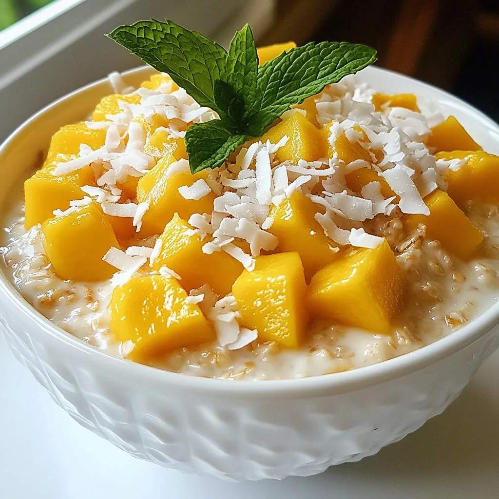 - 1 cup rolled oats - 1 cup coconut milk (from a can or carton) - 1 ripe mango, diced (reserve a little for garnish) - 1/4 cup unsweetened shredded coconut - 2 tablespoons chia seeds - 1 tablespoon maple syrup (or honey) - 1/2 teaspoon pure vanilla extract - A pinch of salt - Fresh mint leaves for garnish (optional) You can use any rolled oats for this dish. Gluten-free oats work too. If you want a different flavor, try almond milk or oat milk instead of coconut milk. For sweetness, honey or agave syrup can replace maple syrup. If you cannot find chia seeds, you can skip them, but they add great texture. This recipe serves two and packs a nutritious punch. Each serving contains about: - Calories: 350 - Protein: 8 grams - Fat: 12 grams - Carbohydrates: 50 grams - Fiber: 10 grams - Sugars: 8 grams Mango and coconut provide vitamins and healthy fats. Chia seeds add omega-3s and fiber. Enjoy this healthy breakfast without the guilt! {{ingredient_image_2}} Start by taking a medium mixing bowl. Add 1 cup of rolled oats to the bowl. Pour in 1 cup of coconut milk. It can be from a can or a carton. Next, add 2 tablespoons of chia seeds. Then, mix in 1 tablespoon of maple syrup and 1/2 teaspoon of pure vanilla extract. Finally, add a pinch of salt. Use a whisk or spoon to stir everything well. You want all the ingredients to blend smoothly. Now, it’s time to add some fun flavors. Carefully fold in 1 ripe mango, diced into small pieces. Also, add 1/4 cup of unsweetened shredded coconut. Be gentle when mixing. You want to keep the mango pieces whole. If you like, set aside a bit of mango and coconut for topping later. This will make your dish look nice when you serve it. Once the mixture is ready, cover the bowl tightly with plastic wrap. You can also divide the oats into jars with lids. Place them in the refrigerator for at least 4 hours. If you can, leave them overnight for the best results. This allows the oats and chia seeds to soak up the coconut milk. In the morning, stir the oats to break up any clumps. If it’s too thick, add a splash of coconut milk. To serve, scoop the oats into bowls or jars. Top with the reserved mango, extra shredded coconut, and fresh mint leaves if you want. Enjoy your refreshing breakfast! To get creamy and smooth overnight oats, follow these simple steps. Use rolled oats, as they absorb liquid well. Mix them with coconut milk and chia seeds. The chia seeds help thicken the mixture overnight. Stir the mix well to avoid clumps. If the oats seem too thick in the morning, add a splash of coconut milk. This keeps the texture just right. You can make these mango coconut oats your own. Try adding other fruits like strawberries or bananas. You can also switch the maple syrup for honey or agave. For a nutty taste, add a spoonful of almond butter. If you want a spicier kick, sprinkle in some cinnamon. The choices are endless, so feel free to experiment. These oats are great for breakfast or a snack. Serve them in bowls for a family breakfast. Put them in jars for a grab-and-go option. They also work well as a healthy dessert. Just top them with extra mango and mint for a fancy touch. You can enjoy them any time of day! Pro Tips Use Fresh Mango: For the best flavor, use a ripe, fresh mango. If it's not in season, frozen mango can be a good alternative. Adjust Sweetness: Feel free to adjust the sweetness according to your taste. Add more maple syrup or honey if you prefer a sweeter breakfast. Make It Ahead: This recipe is perfect for meal prep. You can make multiple servings at once and store them in the fridge for a quick breakfast during the week. Add Variety: Feel free to mix in other fruits or nuts to change up the flavor. Berries, bananas, or almonds can be delightful additions! {{image_4}} You can switch up the fruit in your overnight oats. Try bananas for a creamy taste. Or use berries for a burst of flavor. Pineapple adds a tropical twist. Peaches and apples work well too. Each fruit changes the taste and texture. Mix and match to find your favorite! While coconut milk is rich and creamy, you have choices. Almond milk is light and nutty. Oat milk gives a smooth flavor. Soy milk adds protein and creaminess. You can even use regular cow's milk if you prefer. Each milk brings its own unique taste to the dish. Boost your oats with some extra ingredients. Nuts add crunch and healthy fats. Seeds like flax or pumpkin give more nutrition. A spoonful of yogurt makes it creamy and tangy. You can also add protein powder for a health kick. Each add-in offers different benefits and flavors to enjoy! To keep your mango coconut overnight oats fresh, store them in the fridge. Use a tightly sealed container or a jar with a lid. This helps prevent any odors from other foods. If you made extra, it’s best to separate portions. This way, you can grab a serving when you're ready. You can keep your overnight oats in the fridge for up to five days. The oats will stay tasty and safe to eat. Just check for any signs of spoilage, like an off smell or mold. If it looks or smells strange, throw it away. If you have extra oats, you can freeze them! Use a freezer-safe container or jar. Leave some space at the top, as the oats will expand when frozen. They can last up to three months in the freezer. When you are ready to eat, thaw in the fridge overnight. You can also microwave them for a quick warm-up. Add a splash of coconut milk for creaminess after thawing. You can keep overnight oats in the fridge for up to five days. This makes them a great meal prep choice. Just store them in airtight containers to keep them fresh. It’s best to add toppings, like fruit or nuts, just before eating. Yes, you can use quick oats. They will make the oats softer and creamier. However, rolled oats give a chewier texture. If you prefer a thicker consistency, stick with rolled oats. Yes, this recipe is vegan-friendly. Use maple syrup instead of honey for sweetness. Coconut milk adds a rich, creamy taste, perfect 