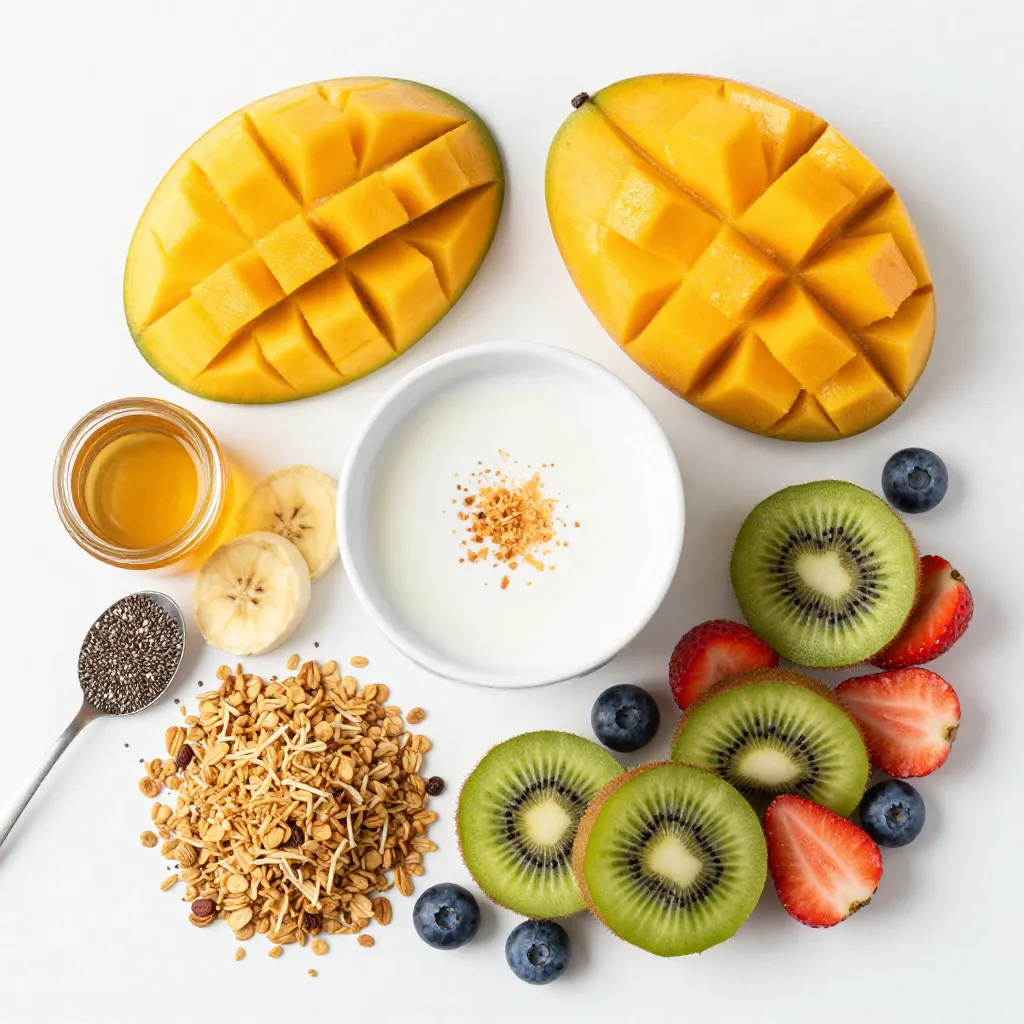 The main ingredients in the Mango Coconut Smoothie Bowl are simple yet full of flavor. Ripe mangoes give the bowl its tropical taste. You need two ripe mangoes, peeled and diced into bite-sized pieces. Full-fat coconut milk adds creaminess. One cup of coconut milk makes it rich and smooth. A ripe banana, sliced, adds natural sweetness and thickness. For a hint of sweetness, use one tablespoon of honey or maple syrup. Chia seeds provide texture and nutrition, so add one tablespoon. Finally, a pinch of pure vanilla extract enhances the overall flavor.