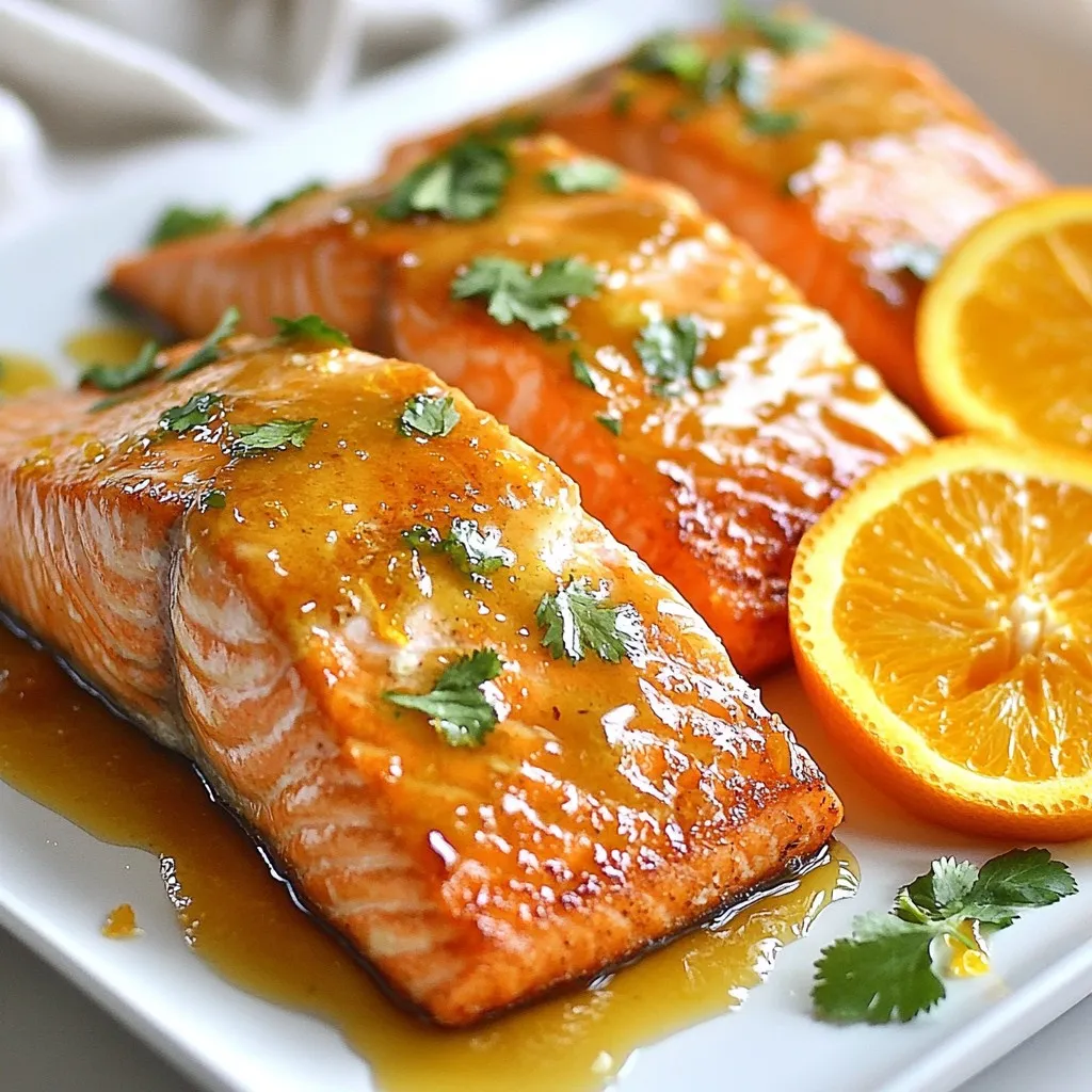 Serve the salmon fillets elegantly arranged on plates, garnished with finely chopped fresh cilantro or parsley, and adorned with thinly sliced orange rounds. Drizzle any remaining glaze over the fillets for an extra burst of flavor.