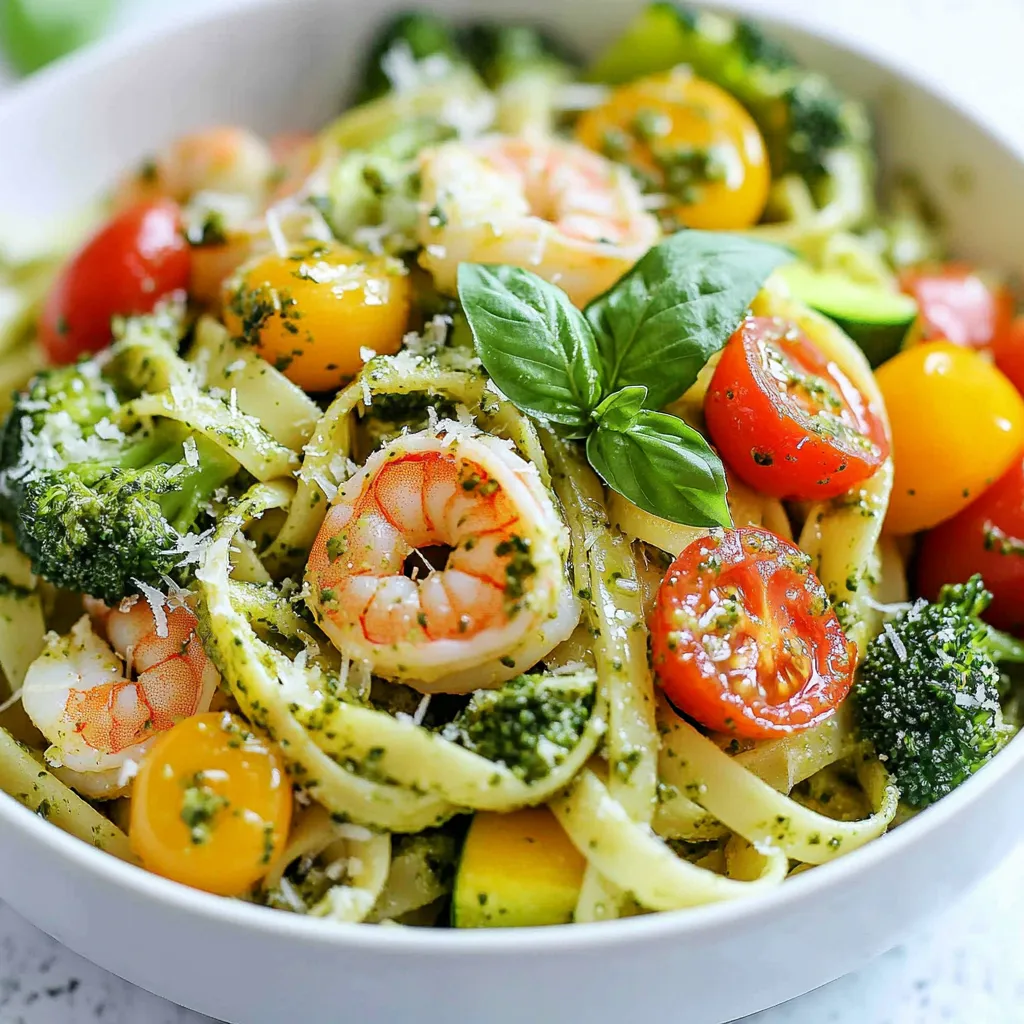 To create a delicious Pesto Shrimp Pasta Primavera, you will need the following ingredients: - 8 ounces fettuccine pasta - 1 pound large shrimp, peeled and deveined - 2 cups broccoli florets - 1 bell pepper, thinly sliced (red or yellow) - 1 medium zucchini, sliced into thin rounds - 1 cup cherry tomatoes, halved - 1/4 cup basil pesto (homemade or store-bought) - 3 tablespoons olive oil - 3 cloves garlic, minced - Salt and pepper to taste - Grated Parmesan cheese for serving (optional) - Fresh basil leaves, for garnish Using fresh ingredients makes a big difference. Choose bright broccoli and firm zucchini. The bell pepper should be crisp, either red or yellow, to add color. Select large shrimp that look fresh and shiny. Fresh shrimp cook up tender and tasty. For pasta, I love using fettuccine, but any pasta you like works great. Quality basil pesto, whether homemade or from a jar, gives the dish its rich flavor. You can easily customize this dish based on what you have or prefer. Here are some ideas: - Add spinach or kale for extra greens. - Toss in some peas for sweetness. - Use asparagus instead of broccoli for a different taste. - Swap the shrimp for chicken or tofu for a different protein. - Try sun-dried tomatoes if you want a stronger flavor. Feel free to mix and match based on your taste and what you have on hand! {{ingredient_image_2}} Start by boiling a large pot of salted water. Once it bubbles, add 8 ounces of fettuccine. Cook it for about 8-10 minutes. You want it to be al dente, which means it should be firm yet tender. After cooking, drain the pasta but save a small cup of pasta water. This will help later on. Next, heat 2 tablespoons of olive oil in a large skillet over medium heat. Once the oil is warm, add 3 cloves of minced garlic. Sauté this for about 30 seconds until it smells great. Then, add 1 pound of peeled and deveined shrimp. Cook each side for 2-3 minutes. They will turn pink and opaque when done. Season with salt and pepper for flavor. Once cooked, take the shrimp out and set them aside. In the same skillet, add 1 tablespoon of olive oil. Toss in 2 cups of broccoli florets, 1 sliced bell pepper, and 1 sliced zucchini. Sauté these for 4-5 minutes. You want them to be tender but still crisp. After that, add 1 cup of halved cherry tomatoes. Cook for another 2 minutes until they soften. Now, return the fettuccine and shrimp to the skillet. Gradually stir in 1/4 cup of basil pesto, mixing it well. Make sure all of the pasta is coated. If it looks dry, add a splash of the reserved pasta water. This helps create a nice creamy sauce. Taste your dish and adjust the seasoning if needed. Now, it’s time to serve! Place the pasta primavera into bowls. For a special touch, sprinkle some grated Parmesan cheese on top. Add a few fresh basil leaves as a lovely garnish. Enjoy your colorful and tasty meal! To cook pasta just right, start with a large pot. Fill it with water and add salt. Bring the water to a boil. Then, add the fettuccine. Check the package for cooking time. Taste it a minute before the time is up. It should be firm but not hard. Drain the pasta but keep a bit of the water. This water helps make the sauce creamy later. For tasty shrimp, use large, fresh shrimp. Peel and devein them before cooking. Heat olive oil in a skillet over medium heat. Add minced garlic first for great flavor. Cook the shrimp for 2-3 minutes per side. Look for a pink and opaque color. Season well with salt and pepper. This step brings out the shrimp's natural sweetness. Pasta primavera shines with colorful veggies. Broccoli, bell peppers, zucchini, and cherry tomatoes work best. They add both crunch and color. Cook them until tender but still crisp. This keeps the dish fresh and vibrant. Feel free to mix in other favorites like carrots or snap peas. Pesto adds depth to your dish. You can use store-bought or homemade. If you want more flavor, add extra garlic or lemon juice. A pinch of red pepper flakes can add some heat. If your pesto is too thick, mix in a little pasta water. This will help it coat the pasta better. Taste as you go to find your perfect balance. Pro Tips Fresh Ingredients Matter: Always use fresh vegetables and high-quality shrimp for the best flavor and texture. Fresh ingredients enhance the dish's overall appeal. Customize Your Pesto: If you're feeling adventurous, try adding nuts like walnuts or pine nuts to your pesto for added depth and texture. You can also experiment with different herbs. Perfectly Cooked Pasta: Ensure your pasta is al dente by following package instructions closely. Overcooked pasta can become mushy and lose its appeal in the dish. Garnish for Presentation: Don't skip the garnish! Fresh basil leaves and grated Parmesan not only add flavor but also make your dish look restaurant-quality. Presentation is key! {{image_4}} You can customize your Pesto Shrimp Pasta Primavera easily. Feel free to swap in other proteins. Chicken or scallops work well and add great flavor. For a plant-based option, try chickpeas or tofu. You can also add more veggies for extra crunch. Consider adding spinach, asparagus, or snap peas. Each brings a unique taste and texture. While basil pesto is classic, feel free to get creative with sauces. Try sun-dried tomato pesto for a rich, tangy twist. A creamy Alfredo sauce can also add a nice touch. For a kick, consider a spicy arrabbiata sauce. These options can change the whole dish and keep it exciting. If you need a gluten-free dish, simply use gluten-free pasta. Many brands offer great options that hold up well. For a vegan meal, swap shrimp for marinated mushrooms or lentils. Use a vegan pesto made with nuts and nutritional yeast instead of cheese. These changes ensure everyone can enjoy this tasty dish. To store leftover pesto shrimp pasta primavera, place it in an airtight container. Make sure to let it cool to room temperature first. The pasta will stay fresh for up to three days in the fridge. If you have extra basi