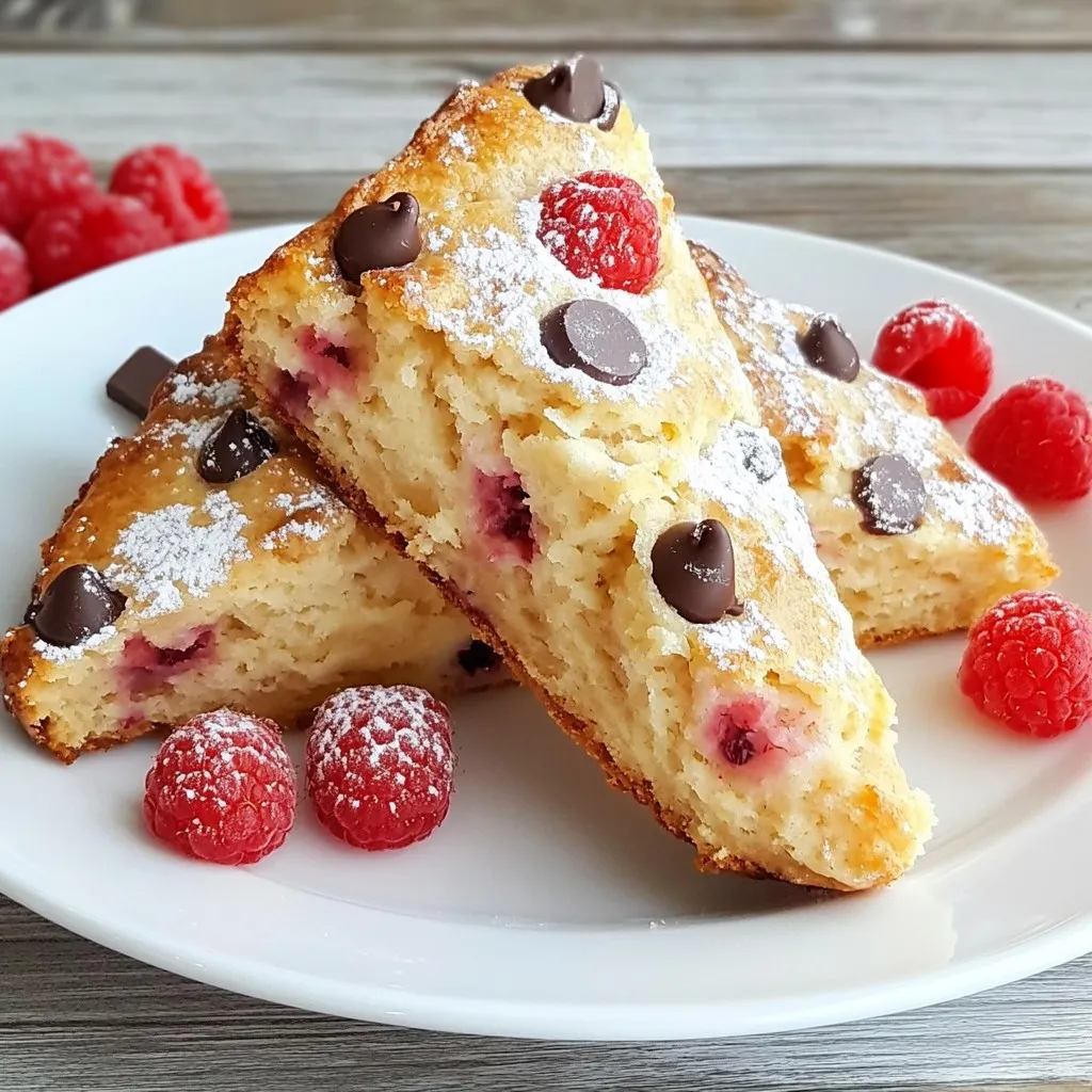 - 2 cups all-purpose flour - 1/4 cup granulated sugar - 1 tablespoon baking powder - 1/2 teaspoon salt - 1/2 cup cold unsalted butter, cut into small cubes - 1/2 cup heavy cream - 1 large egg - 1 teaspoon pure vanilla extract - 1 cup fresh raspberries, rinsed and patted dry - 1/2 cup semi-sweet chocolate chips - 1 tablespoon coarse sugar for sprinkling To make the best Raspberry Chocolate Chip Scones, you need to gather all your ingredients first. Using high-quality flour is key to a fluffy texture. The granulated sugar adds just the right amount of sweetness. Baking powder helps the scones rise, while salt enhances all the flavors. For the wet ingredients, the cold unsalted butter is crucial. It creates flaky layers in your scones. Heavy cream adds richness, while the egg binds everything together. Pure vanilla extract gives a lovely aroma and taste. Now for the fun part! Fresh raspberries and semi-sweet chocolate chips are what make these scones a treat. The raspberries burst with flavor, and the chocolate brings a sweet touch. Finally, sprinkle coarse sugar on top for a crunchy finish. {{ingredient_image_2}} - First, preheat your oven to 400°F (200°C). - Next, prepare a baking sheet. Line it with parchment paper. This helps with easy scone removal later. - In a large bowl, combine the dry ingredients: all-purpose flour, sugar, baking powder, and salt. - Now, add the cold cubed butter to the flour mixture. Use a pastry cutter or your fingers. Work the butter into the flour until it looks like coarse crumbs. Leave some larger chunks for flakiness. - In a separate bowl, mix the wet ingredients. Whisk together the heavy cream, egg, and vanilla extract until smooth. - Pour the cream mixture into the flour mix. Stir gently with a spatula until just combined. Do not overmix; this keeps the scones tender. - Carefully fold in the fresh raspberries and chocolate chips. Be gentle to avoid crushing the raspberries. - Turn the dough onto a lightly floured surface. Knead gently until it comes together. Avoid overworking the dough. - Flatten the dough into a circle, about 1 inch thick. Cut it into wedges or use a round cutter for perfect shapes. - Place the scones on the prepared baking sheet. Leave about 1 inch between each scone to allow for rising while baking. - Sprinkle the tops with coarse sugar for extra sweetness and texture. - Bake for 15-20 minutes. Watch for a golden brown color on top. A toothpick should come out clean when inserted into the center. Cold butter is key to flaky scones. It helps create layers. When you mix the butter, leave some chunks. These will melt during baking and make your scones rise. Avoid overmixing the dough. This can lead to tough scones. Mix just until the ingredients come together. Remember, less is more. Knead the dough gently. You want it to hold together without being heavy. Too much kneading can make your scones dense. After kneading, shape the dough carefully. Use a sharp knife to cut even wedges. This helps them bake uniformly. If you prefer round scones, use a round cutter. Serve your scones warm for the best taste. They pair well with clotted cream or softened butter. You can also sprinkle powdered sugar on top for a sweet touch. For a beautiful presentation, place them on a decorative platter. Add fresh raspberries or mint leaves for color. This makes your treat even more inviting. Pro Tips Chill the Butter: For the flakiest scones, ensure your butter is very cold. You can even chill the mixing bowl and utensils beforehand. Don’t Overmix: Mix the dough until just combined. Overmixing can lead to tough scones, so handle the dough gently. Use Fresh Ingredients: Opt for fresh raspberries and good quality chocolate chips for the best flavor and texture in your scones. Experiment with Flavors: Feel free to add lemon zest or almond extract for an extra layer of flavor that complements the chocolate and raspberries. {{image_4}} You can change the flavor of your scones easily. Try using other berries like blueberries, strawberries, or blackberries. Each berry brings its own taste and color. For chocolate, switch to white chocolate or dark chocolate. This can give your scones a new twist! If you need gluten-free scones, substitute all-purpose flour with a gluten-free blend. Make sure to check that it has xanthan gum for the best results. For a dairy-free option, use coconut cream instead of heavy cream. You can also use vegan butter for the same yummy taste. Incorporate seasonal fruits for a fresh touch. In spring, use strawberries; in summer, try peaches. In fall, add apples or pears for warmth. For winter holidays, mix in candied ginger or cranberries. These changes make your scones festive and fun! After baking, let your scones cool on a wire rack. This keeps them from getting soggy. Once cooled, place them in an airtight container. You can store them at room temperature for up to two days. Make sure to keep them away from heat or moisture. To freeze scones, let them cool completely first. Wrap each scone in plastic wrap. Then, place them in a freezer bag or container. They will stay good for about three months in the freezer. When you want to eat them, take them out and reheat. You can bake them from frozen for about 15-20 minutes at 350°F (175°C) or until warm. Raspberry chocolate chip scones will last for two days at room temperature. In the freezer, they last for three months. Signs of spoilage include a hard texture or an off smell. If you see any mold, it's best to toss them. Enjoy your treat while it’s fresh! To reheat scones, preheat your oven to 350°F (175°C). Place the scones on a baking sheet. Heat them for about 5 to 10 minutes. This warms them evenly and keeps them flaky. You can also use a microwave for a quick fix. Heat them for about 10 to 15 seconds. Just be careful; microwaving too long can make them tough. Yes, you can make the dough ahead of time. After mixing the dough, wrap it tightly in plastic wrap. Store it in the fridge 