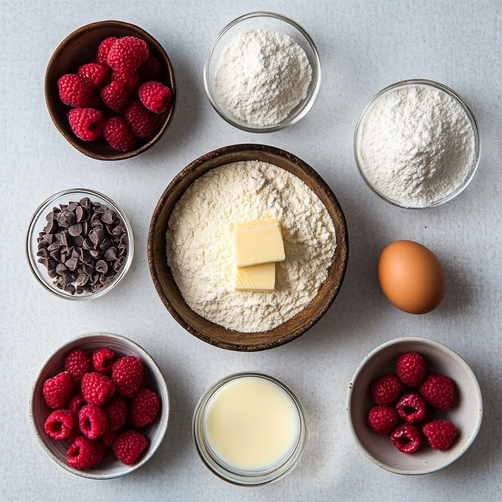 To make the best Raspberry Chocolate Chip Scones, you need to gather all your ingredients first. Using high-quality flour is key to a fluffy texture. The granulated sugar adds just the right amount of sweetness. Baking powder helps the scones rise, while salt enhances all the flavors.