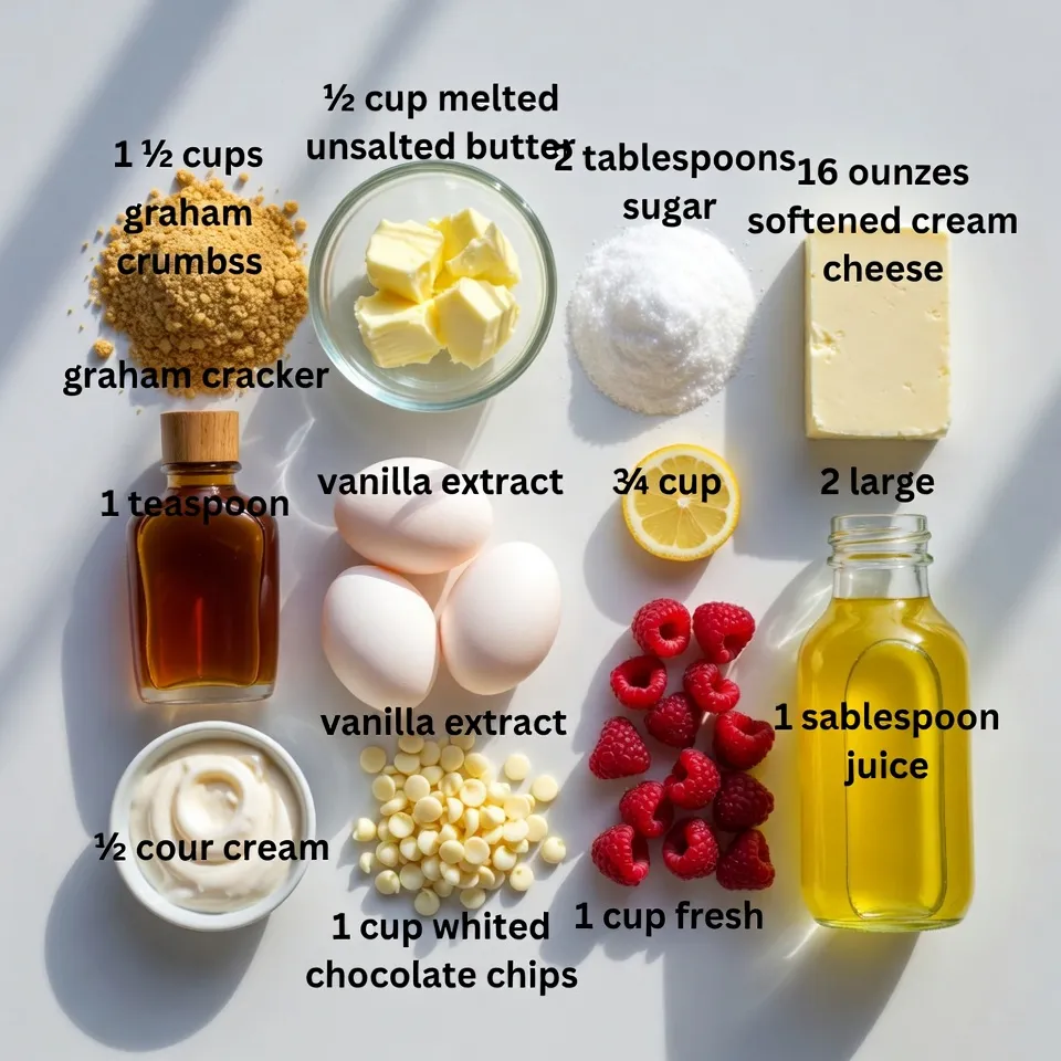 Gather these ingredients to make your Raspberry White Chocolate Cheesecake shine!