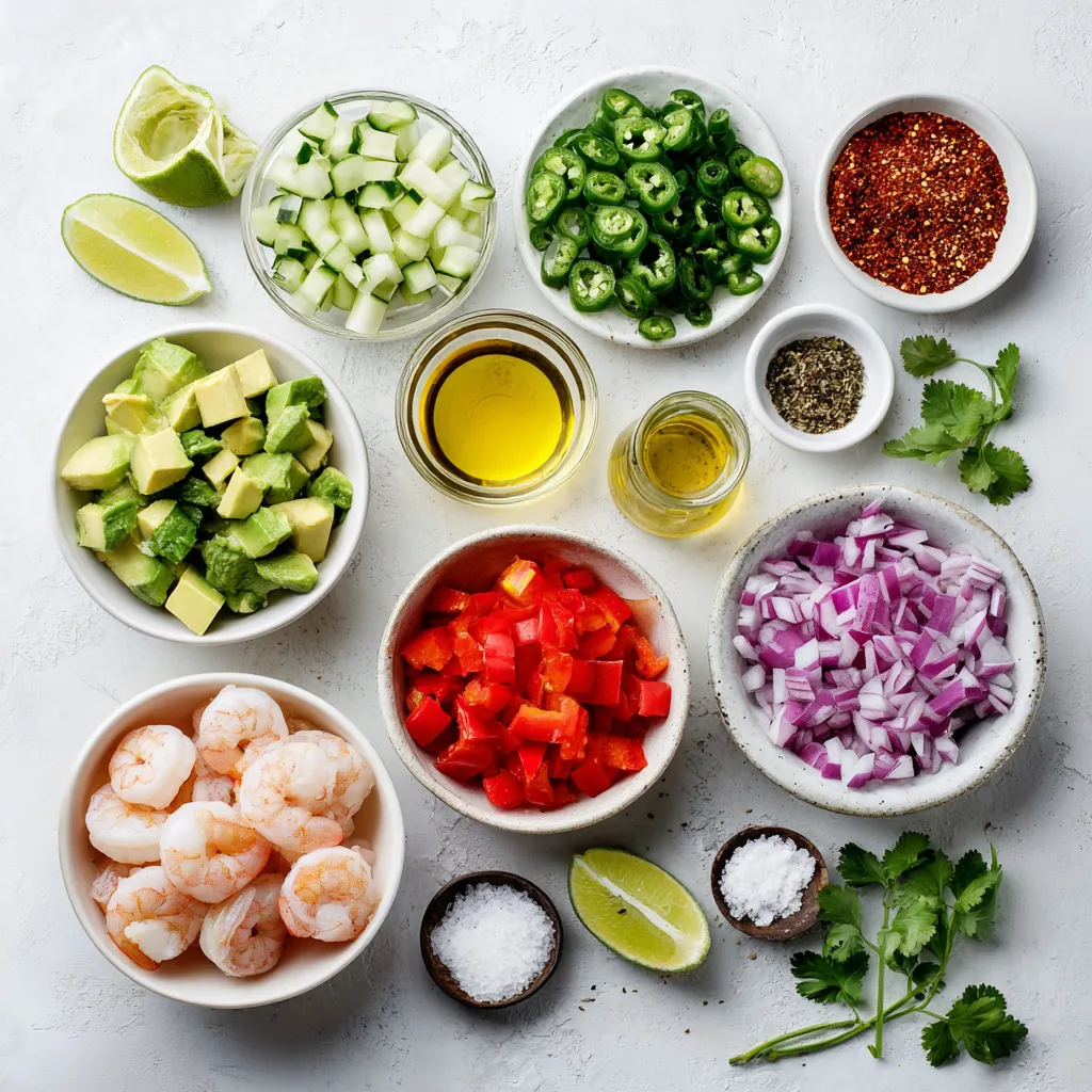 I love using fresh and bright ingredients for this salad. Large shrimp add a nice protein boost. I choose ripe avocados for their creamy texture. Fresh vegetables like cucumbers and bell peppers bring crunch and color. The jalapeño adds a spicy kick, while red onion gives a slight bite.
