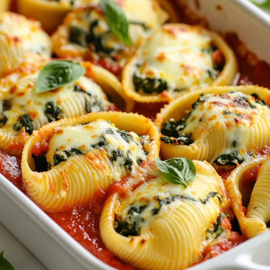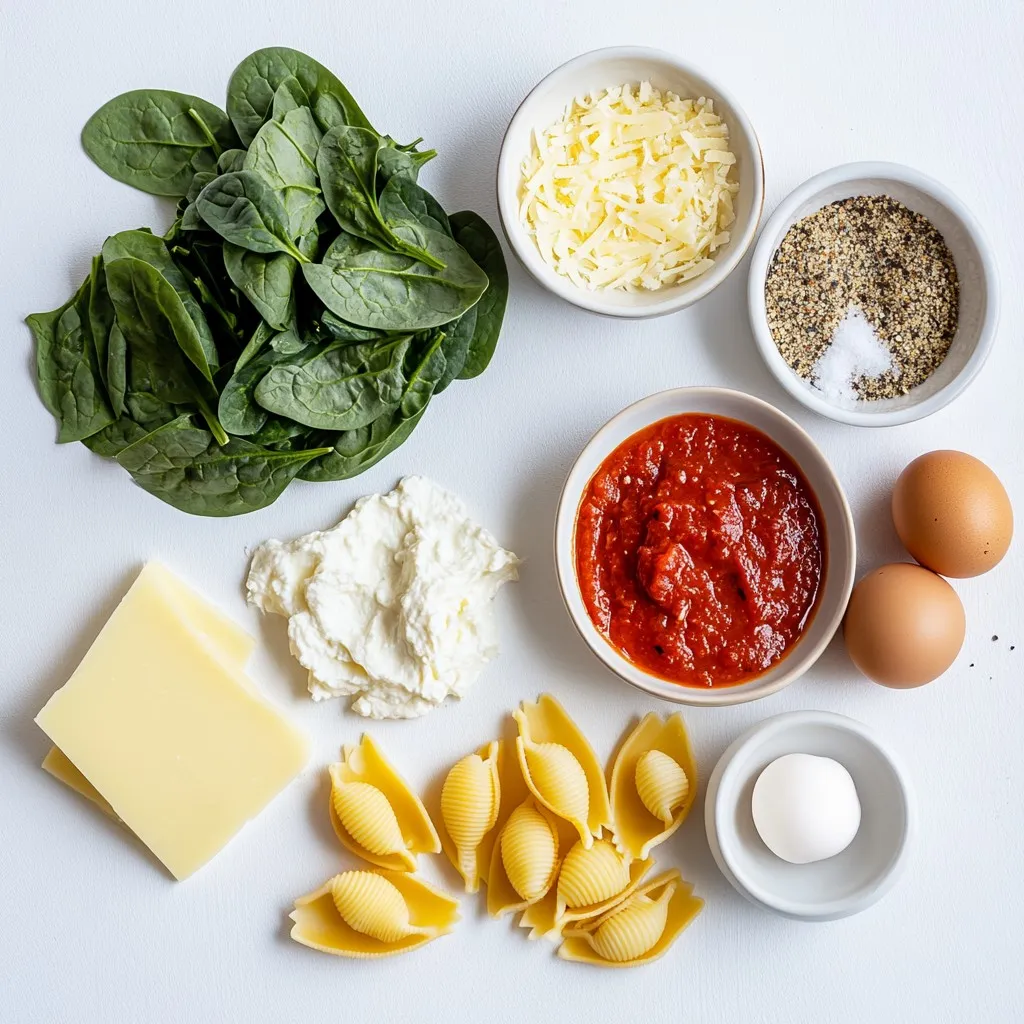For this recipe, you need jumbo pasta shells. They hold the filling well and look great on the plate. Fresh spinach adds a nice color and taste. I love using ricotta cheese for its creamy texture. Shredded mozzarella is key for the cheesy topping. Parmesan gives a salty kick that enhances the flavors.