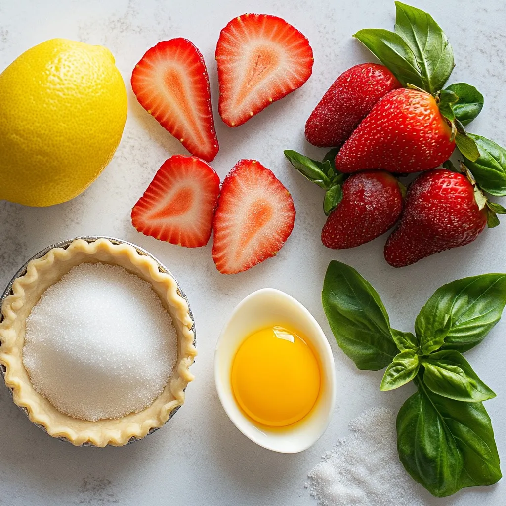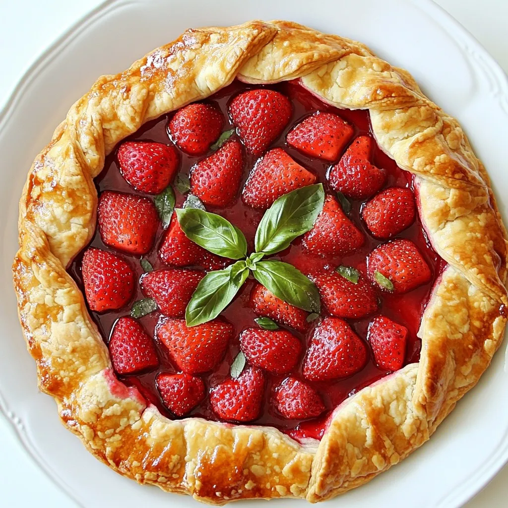 For this galette, you need 2 cups of fresh strawberries. Make sure to hull and slice them. Fresh strawberries give the best taste and color. They should be ripe and sweet. You can taste a slice to check their sweetness. You will also need a few other key ingredients: - 1 tablespoon granulated sugar: This adds sweetness to the strawberries. - 1 tablespoon fresh lemon juice: This brightens the flavor. - 1 tablespoon cornstarch: This helps thicken the juices. - 1 tablespoon fresh basil, finely chopped: This adds a unique, herbal touch. - 1 pre-made pie crust or galette dough: This makes your life easier. - 1 egg, beaten: This is for the egg wash to give shine. - 1 tablespoon coarse sugar: This is for sprinkling on top. For a nice finish, you might want to add some optional garnishes: - Fresh basil leaves: These look pretty and enhance flavor. - Creamy vanilla ice cream: This adds a rich, cold contrast to the warm galette. These ingredients combine to make a sweet and savory treat. The fresh strawberries and basil create a delightful balance. Enjoy gathering these items before you start cooking! {{ingredient_image_2}} Start by preheating your oven to 425°F (220°C). This is key for a crisp crust. A hot oven helps the dough cook evenly and rise well. In a bowl, mix 2 cups of fresh strawberries, 1 tablespoon of granulated sugar, 1 tablespoon of fresh lemon juice, 1 tablespoon of cornstarch, and 1 tablespoon of finely chopped basil. Toss gently so the strawberries get coated. Let it sit for about 10 minutes. This step helps the strawberries release their sweet juices. On a lightly floured surface, roll out your pie crust. Aim for a circle about 12 inches wide. Once rolled, carefully move the dough to a parchment-lined baking sheet. This will catch any juices that may drip while baking. Spoon your strawberry mix into the center of the dough. Leave a 2-inch border around the edges. This space allows for the beautiful folding that gives the galette its rustic charm. Using a pastry brush, apply the beaten egg to the edges of the dough. This makes the crust shiny and golden. Next, sprinkle 1 tablespoon of coarse sugar over the crust. This adds a delightful crunch and sweetness. Place the galette in your preheated oven. Bake for 25-30 minutes. Watch for a golden crust and bubbling filling. When done, take it out and let it cool for 10 minutes. This cooling helps the filling set and makes slicing easier. To get a great crust, use cold ingredients. I recommend chilling your pie crust for 30 minutes. This helps it stay flaky. Roll the dough on a lightly floured surface. Aim for a 12-inch circle. Don’t worry about making it perfect; rustic looks are charming! To bring out the best in your strawberries, mix them with sugar and lemon juice. This helps sweeten and brighten their flavor. Let the mixture sit for about 10 minutes. The juices will flow and create a tasty filling. Add finely chopped basil to give a fresh taste. Basil pairs well with strawberries, creating a lovely blend. When serving, slice the galette while warm. It looks great and tastes better that way! For a special touch, add fresh basil leaves or a scoop of ice cream. To store leftovers, place them in an airtight container. Keep it in the fridge for up to three days. You can reheat slices in the oven for a few minutes. Enjoy the flavors again! Pro Tips Use ripe strawberries: Ensure your strawberries are ripe and sweet for the best flavor. This will enhance the overall taste of the galette. Chill the dough: If your dough is warm, it may become difficult to handle. Chill it in the refrigerator for 15-20 minutes before rolling it out for easier manipulation. Experiment with herbs: Try adding other herbs like mint or thyme along with basil for a unique flavor twist that complements the strawberries beautifully. Serve with a drizzle: For an extra touch, drizzle the galette with balsamic reduction or honey before serving for added sweetness and sophistication. {{image_4}} You can mix things up with other herbs. Mint pairs well with strawberries. It adds a fresh twist. Thyme also works great, offering a unique taste. You can try rosemary too. Just use a small amount to avoid overpowering the fruit. Each herb brings its own charm to the galette. Experimenting lets you find your favorite flavor. If you need a gluten-free option, don’t worry! You can use gluten-free pie crusts. Many brands offer ready-made options. You can also make your own crust with almond flour or oat flour. Just follow the same steps for rolling and baking. Your galette will still be tasty and crispy. Feel free to swap strawberries for other fruits. Ripe peaches or nectarines are delightful in summer. In fall, use apples or pears for a warm flavor. You can even mix fruits, like strawberries and blueberries, for a colorful twist. Each fruit has its own sweetness and texture. This way, your galette stays fresh and fun all year! To keep your Strawberry Basil Galette fresh, store it in the fridge. Use an airtight container. This helps keep moisture in and prevents it from getting soggy. The galette stays good for about three days in the fridge. If you want to serve it later, make sure to cool it completely before storing. If you want to save your galette for later, freezing works great. First, let the galette cool down. Wrap it tightly in plastic wrap, then put it in a freezer bag. This helps prevent freezer burn. You can freeze it for up to two months. When you're ready to enjoy it, thaw it in the fridge overnight. To reheat your galette, preheat your oven to 350°F (175°C). Place the galette on a baking sheet. Heat it for about 10 to 15 minutes. This warms it up and keeps the crust crispy. You can also use the microwave, but it might make the crust soft. For best results, stick to the oven method. A galette is a free-form pie. It has a rustic look and is easy to make. Unlike a traditional pie, you do not need a pie pan. The dough wraps around the filling. This lets the frui