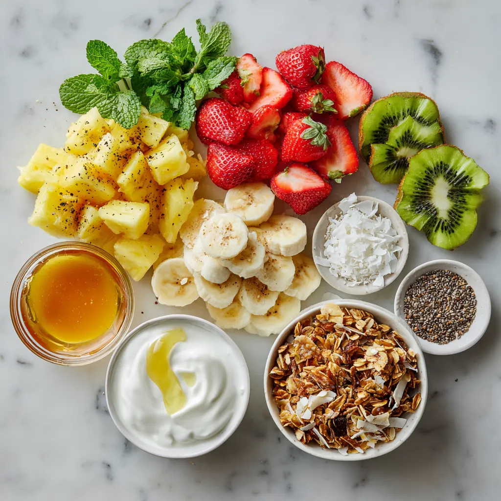 For this delightful smoothie bowl, frozen pineapple chunks are key. They give a sweet, tropical taste and a creamy texture when blended. A ripe banana adds natural sweetness and creaminess, making each bite smooth. Coconut milk adds richness, but feel free to use almond or oat milk if you prefer. Greek yogurt boosts creaminess and protein, but you can swap it for dairy-free yogurt to keep it vegan. If you like it sweeter, honey or agave syrup is an easy option.
