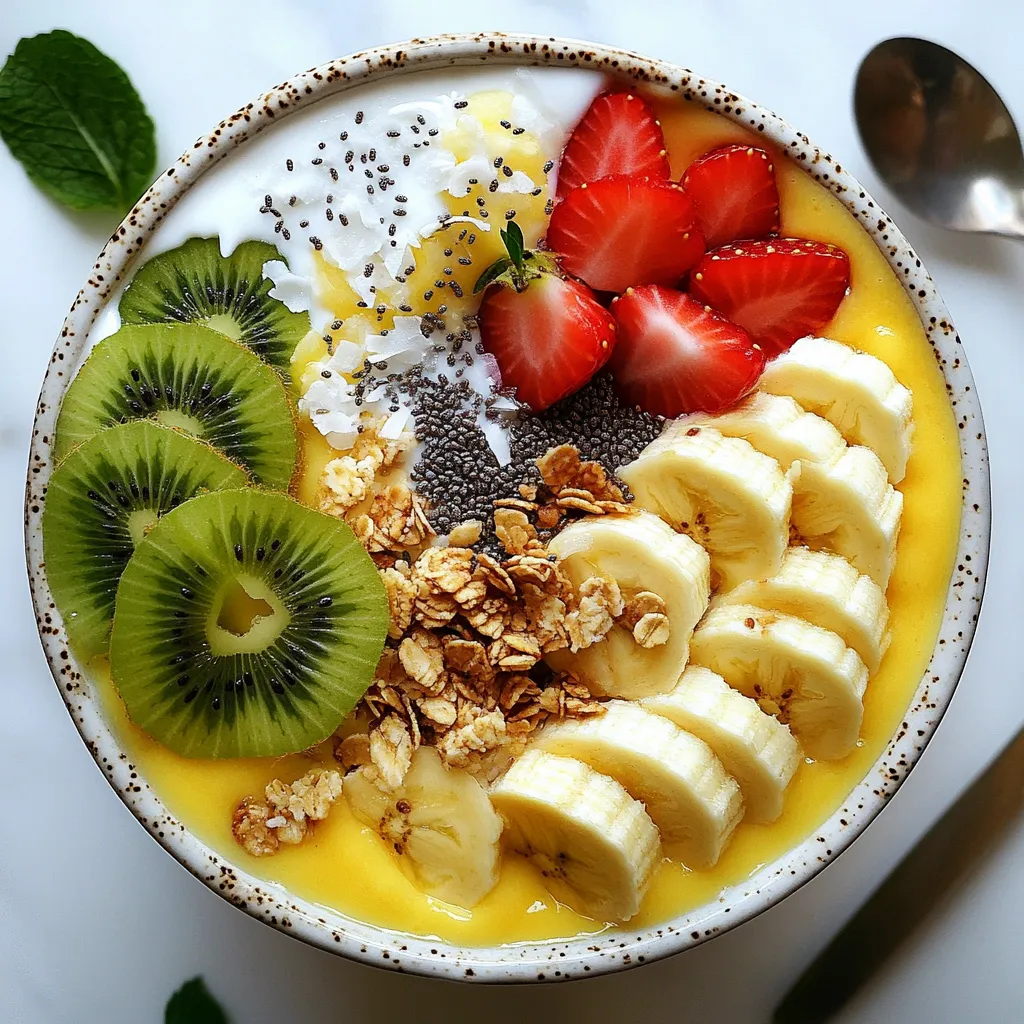 Now for the fun part! Pour your smoothie mixture into a bowl. Make sure you create a thick base. For toppings, get creative! Arrange sliced fresh fruits like kiwi and strawberries. Add a sprinkle of crunchy granola and a dash of chia seeds. Don’t forget the shredded coconut for that tropical flair.