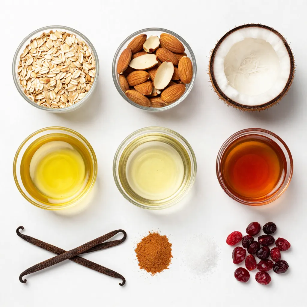 To make Vanilla Almond Granola, you need simple and tasty ingredients. Each one adds flavor and nutrition. Here’s what you’ll need: