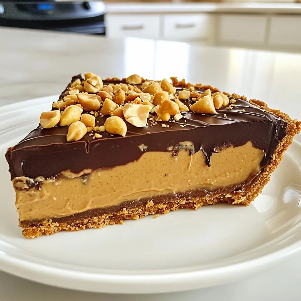 A delicious and creamy vegan pie made with a graham cracker crust, peanut butter filling, and a rich chocolate topping.